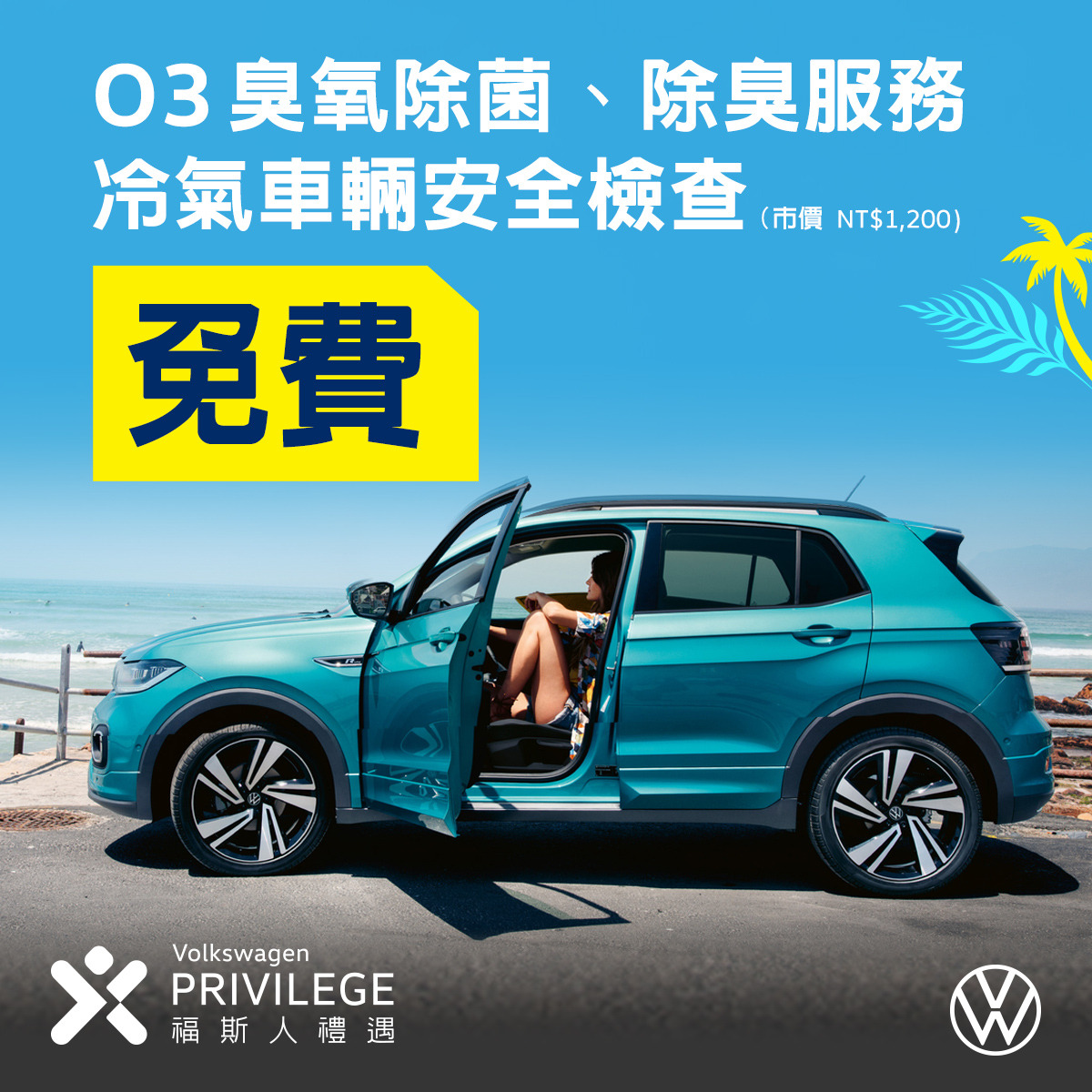 Volkswagen致力守護全方位行車安全,為迎接盛夏,6月1日至7月31日止展開夏季健檢,車主預約回廠即可進行免費23項行車安全檢查,包含空調、冷卻、煞車、輪胎、電瓶等各系統檢查,以及O3臭氧除菌、除臭服務,採用專業型 O3 空氣臭氧殺菌機進行全車快速淨化空氣,利用臭氧將病毒細菌氧化分解,達到殺菌除臭效果,帶給車主清淨舒適的車室空間;而原廠冷氣壓縮機大降價37,795元起(原價74,870元起),加入「福斯人禮遇計畫」再享8折起、冷氣風箱清洗套餐價1,988元,迎來消暑的車室環境。