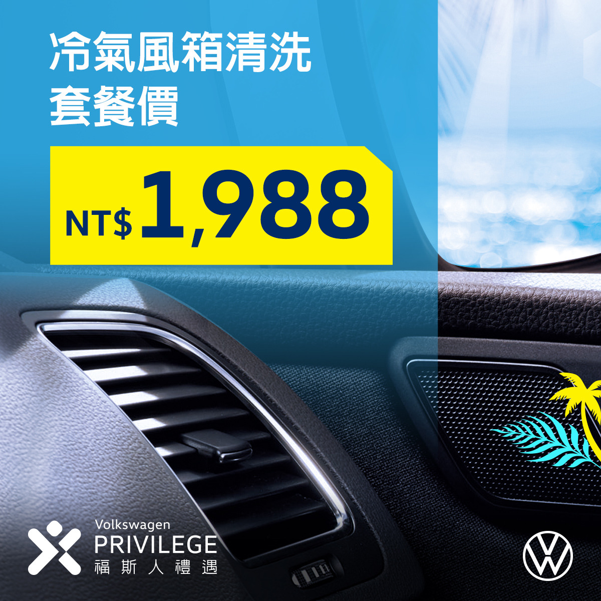 ●原廠冷氣壓縮機降價,更換僅需37,795元起,夏季健檢活動期間「福斯人禮遇計畫」會員另有 8折起的折扣,並且獨享冷氣風箱清洗套餐價1,988元,給予會員潔淨清涼的車室空間。