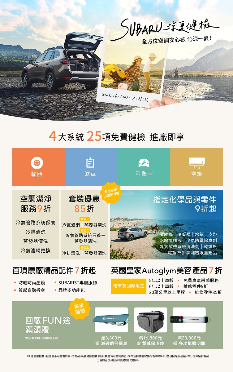 炎炎夏日即將到來,為讓車主能安心和舒適的享受盛夏旅行,SUBARU自6月1日起至8月31日止,特別推出「2022 SUBARU涼夏健檢」,提供包含輪胎、煞車、引擎室、空調等四大系統共25項免費健檢。此外,更推出空調潔淨清涼系列9折、空調潔淨清涼套餐85折優惠,以及原廠零配件/美容產品等多重優惠回饋,單筆消費滿8,800元起再贈實用的夏日戶外必備好禮。