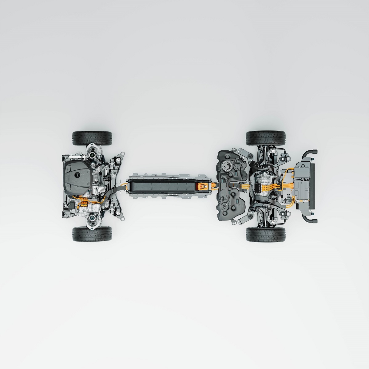 在電池模組的改革上,原本放置在前座與後座中央的四輪傳動軸空間中的鋰電池被重新排列,以獲取更大的效能。單一模組共16個串聯電池芯升級為34個串聯,原先縱向排列的6個電池模組也改為3個橫列堆疊,總體電池芯的數量從96個提升為102個,在電池技術進步帶來更佳的能量密度前提下,單一電池芯容量從34 Ah進步為51Ah,進而創造出18.8kWh的電池總容量,eAWD 後軸動力心臟的電動馬達功率從65kW大幅提升至107kW,可輸出扭力亦從24.5kgm提升至31.5kgm,馬達功率提升後讓PHEV全車系純電行駛極速從120km/h提高到140km/h,它的純電行駛里程也從早期的36.6公里提升到88公里,平均油耗更是從34.7公里/升提高到55.9公里/升,驚人吧!您能想像到這樣一部2.3噸大SUV的油耗比家裡的125 c.c.的摩托車還要省油嗎?
