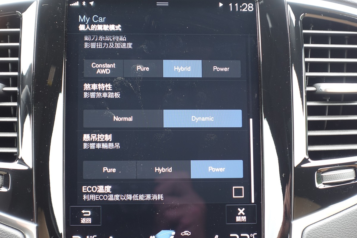 前後軸使用不同的動力,造就了XC90 T8 Recharge Inscription的駕駛模式多樣化,原本在水晶排檔桿後方的Drive Mode駕駛模式旋鈕已經取消,改由中央觸控屏選擇Constant AWD持續四驅模式、Pure純電模式、Hybrid混合動力模式、Power動力模式及Off Road越野模式,可以因應不同路況下去選擇最佳的對應駕駛模式,但是還有一個隱藏板的駕駛模式,可以從My Car個人駕駛模式中去選擇動力、剎車特性、懸吊控制上去找到自己最愛的駕駛模式,試駕車其實還有選配了Four-C可調式氣壓式懸吊控制系統,能依照不同駕駛模式去調整車高及懸吊軟硬度,完全符合道路行駛及越野的雙重需求,只是這套Four-C可調式氣壓式懸吊控制系統是選配,消費者必須多支付15萬元才能擁有。