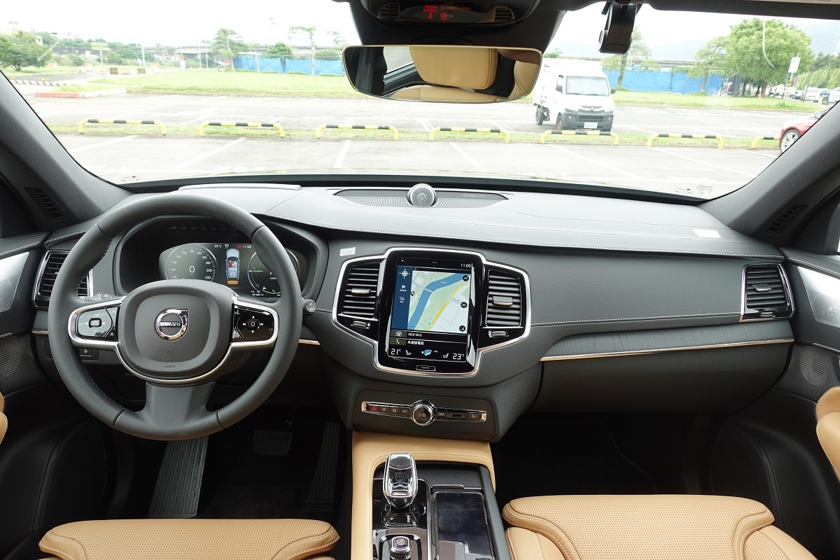 整體儀表台也是走簡約設計風,中控台除了保留音響的控鍵外,車輛的行駛模式、動態設定及媒體、CleanZone空調、車內外燈光設定、導航等等,都在直幅的九吋觸控屏幕上觸控操作,語言介面是繁體中文,操作邏輯簡單但卻資訊功能豐富,可以自我設定的選項超多,可以客制化變成個人專屬的VOLVO XC90。駕駛儀表是12.3吋全數位模擬螢幕,可以隨著駕駛模式的變換而轉變顯示面貌,多媒體部分當然也支援Apple Carplay及Android的連結,最棒的是全車搭載英國B&W的品牌音響,包含重低音在內共有19支揚聲器,在寧靜的車廂內營造出非常棒的聆聽效果。