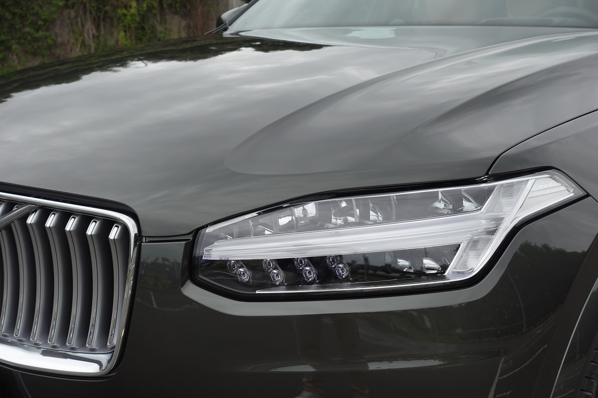 雖然第二代XC90已經問世幾年了,但是身為VOLVO的旗艦SUV,外型設計在瑞典北歐風簡約設計的風格下,還是有著低調奢華的用料質感,雷神之錘造型的LED日行燈兼方向燈之下,是智慧型的LED頭燈組。車頭VOLVO的品牌識別ID標誌立於鍍鉻直瀑水箱護罩中間,搭配下氣壩兩側的鍍鉻飾框,線條簡單卻霸氣十足。車側只有上下兩條腰線,上腰線由車頭燈旁平行貫穿至車尾燈,下腰線連結前後輪拱,更下方則是一條鍍鉻的飾條,上面還有RECHARGE字樣,直接表明它PHEV雙能電動的身分。車尾的線條依舊簡潔,LED尾燈擺於尾門的兩側,VOLVO標準字排列中間,下氣壩鍍鉻的飾條輝映全車窗框飾條,高級感絲毫不缺。