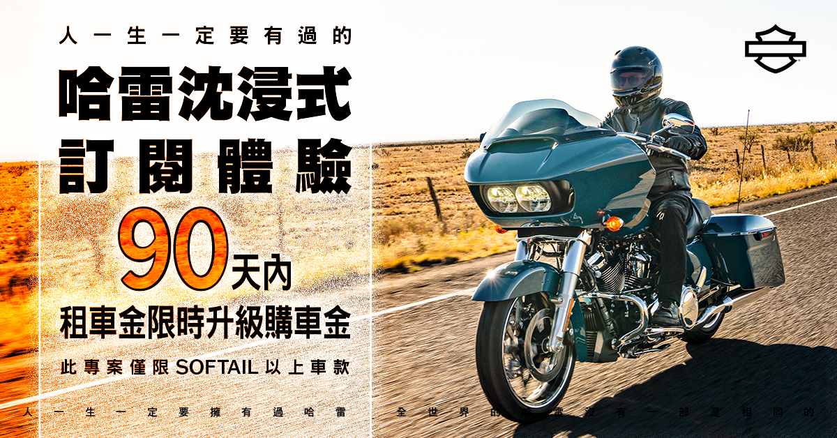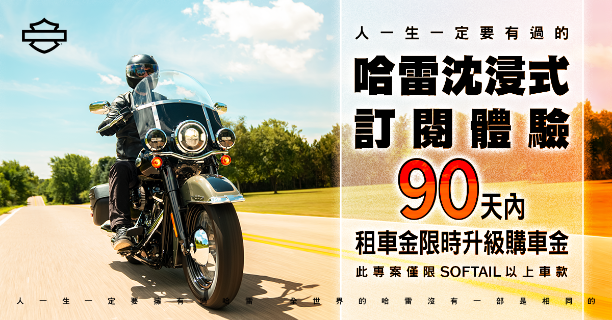 Harley-Davidson台灣總代理太古鼎翰宣布推出業界首創沉浸式訂閱體驗專案,即日起提供全車系短期租賃服務。重機愛好者不僅將有機會自由感受哈雷各式車款的多元騎乘體驗,於90天內購車更可享受租車金升級購車金的超值優惠。試乘賞車一步到位,演繹專屬於你的美國精神,輕鬆入主哈雷就趁現在!