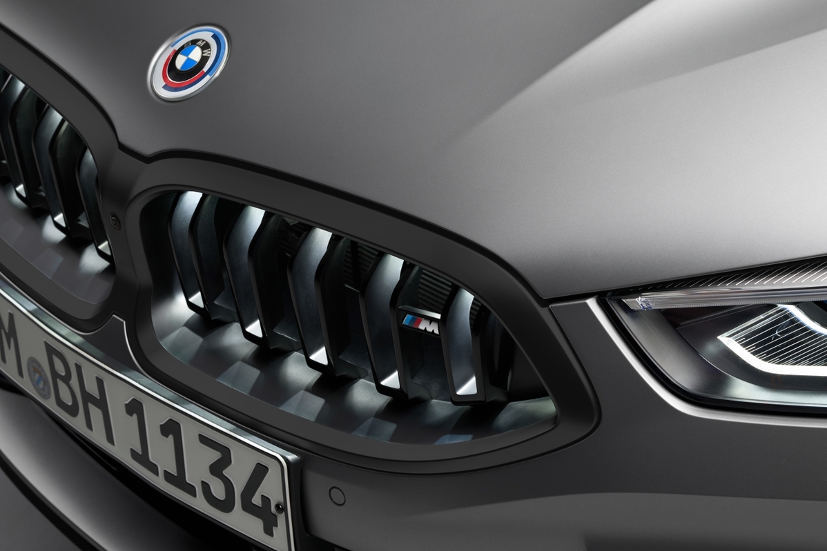 將力量感與紳士般的優雅脫俗風格完美匯聚,全新BMW 8系列Gran Coupé達到5米的車身長度搭配長車頭、短前懸的完美比例,展現了BMW對於美型與品味的堅持,車頭處全新設計的雙肋直柵式BMW飾光水箱護罩不僅為8系列Gran Coupé型塑了跑格身影,M850i xDrive Gran Coupé燻黑造型內嵌湛藍風采的智慧雷射頭燈(含Glare-free光型變化功能)及BMW M 50週年紀念廠徽,50週年的專屬設計將M的熱血氛圍透過頂級工藝與專屬設計細膩詮釋,結合專屬橫柵造型的前進氣壩設計,讓車頭線條更顯開闊霸氣,展演前衛登頂的無比氣勢。
