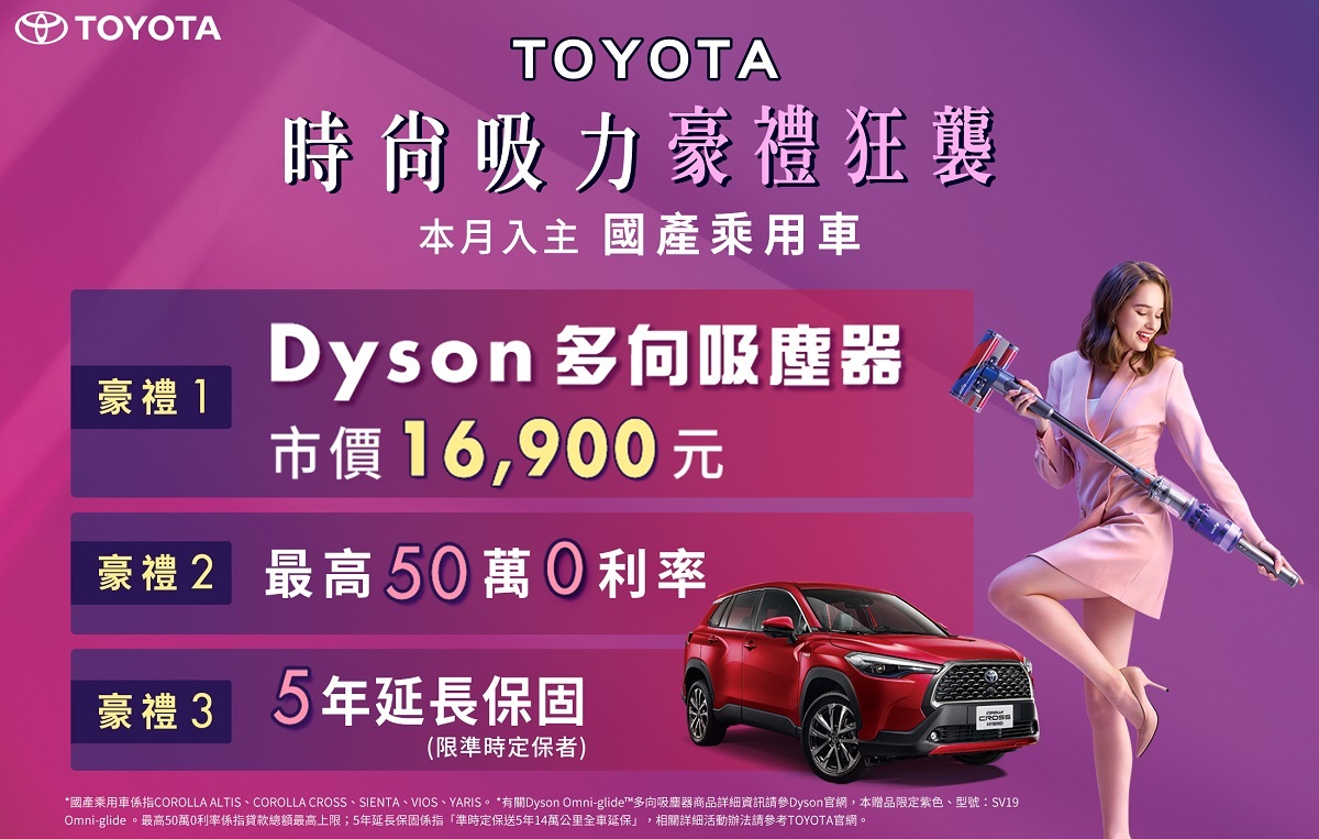 為感謝消費者長久以來的支持與關愛,TOYOTA台灣總代理和泰汽車於7月推出「TOYOTA 時尚吸力 豪禮狂襲」活動:入主國產乘用車,送「Dyson多向吸塵器」(Dyson