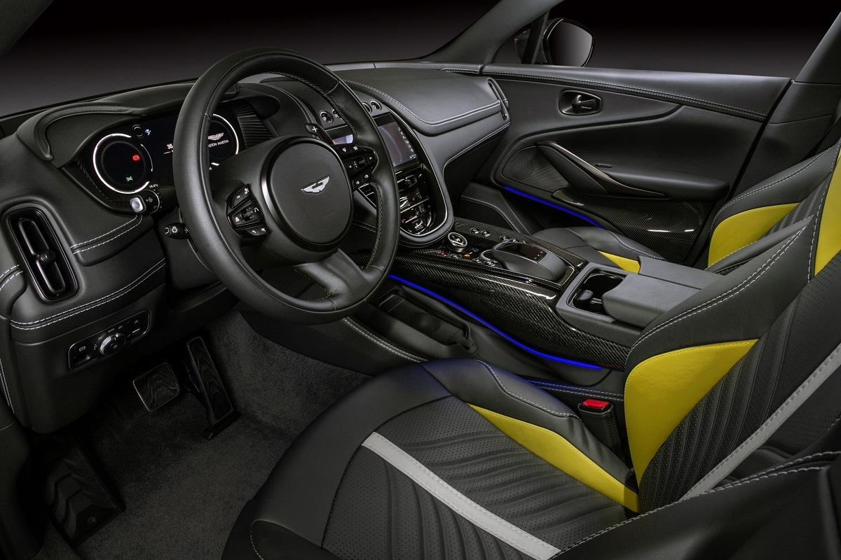 與Electron Yellow電流黃配色與外觀風格相互呼應,搭配擁有座椅頭枕 ASTON MARTIN Logo 繡線徽飾、飛翼繡紋與座椅網孔的運動化升級座椅,附有電動座椅十六向調整及前後座電熱座椅功能;中控飾板選用交織斜紋碳纖維材質,緊扣DBX707強調速度感的設計靈魂。