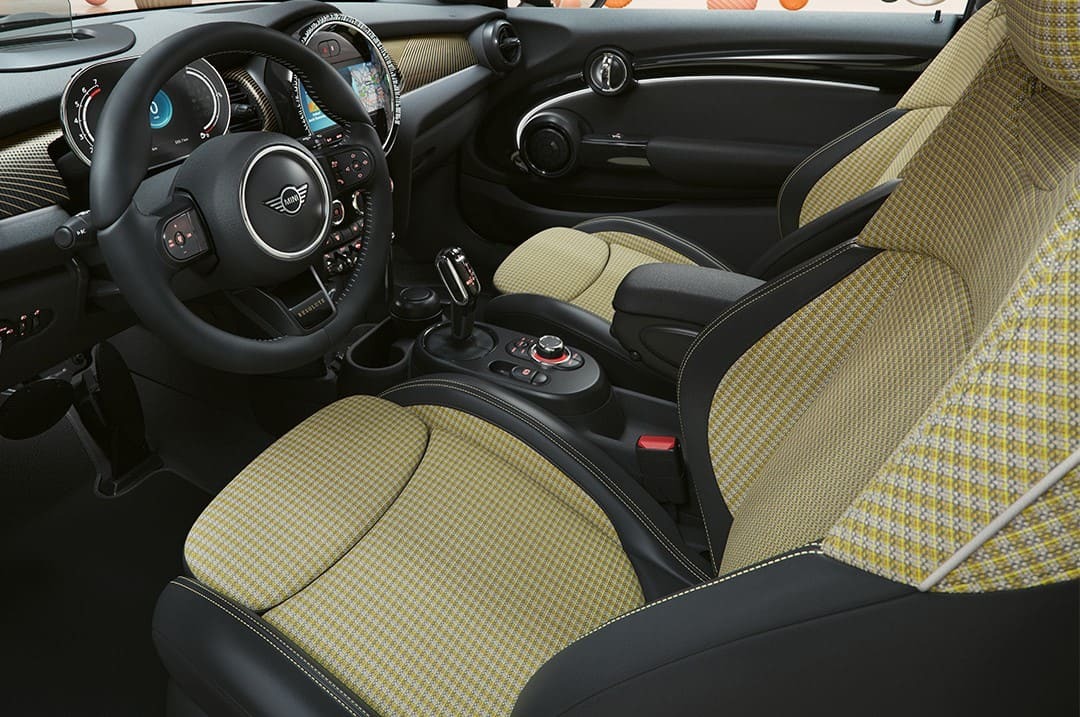 座艙空間,經典加乘。MINI Resolute Edition內裝採用以黃灰格紋為基調的Black Pearl Light Chequered高級織布拼接透氣皮質內裝,源自於蘇格蘭高地文化的Tartan格紋圖樣設計,不僅讓座艙空間漫著渾然天成的英倫情懷,更為致敬1959年第一台Classic Mini的格紋內裝。符合人體工學設計的座椅、細膩的Carbon Black真皮腿靠與扶手、醒目的黃色對比縫線搭配透氣的高級織布,盡顯MINI Resolute Edition經典時尚與實用舒適兼具的貼心。除此之外,Black Pearl Light Chequered內裝布面採用100%可回收材料,帶來舒適乘坐體驗的同時,亦落實MINI追求永續、友善地球的品牌信念。