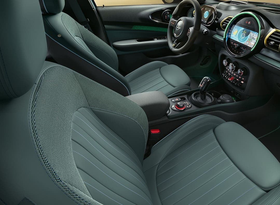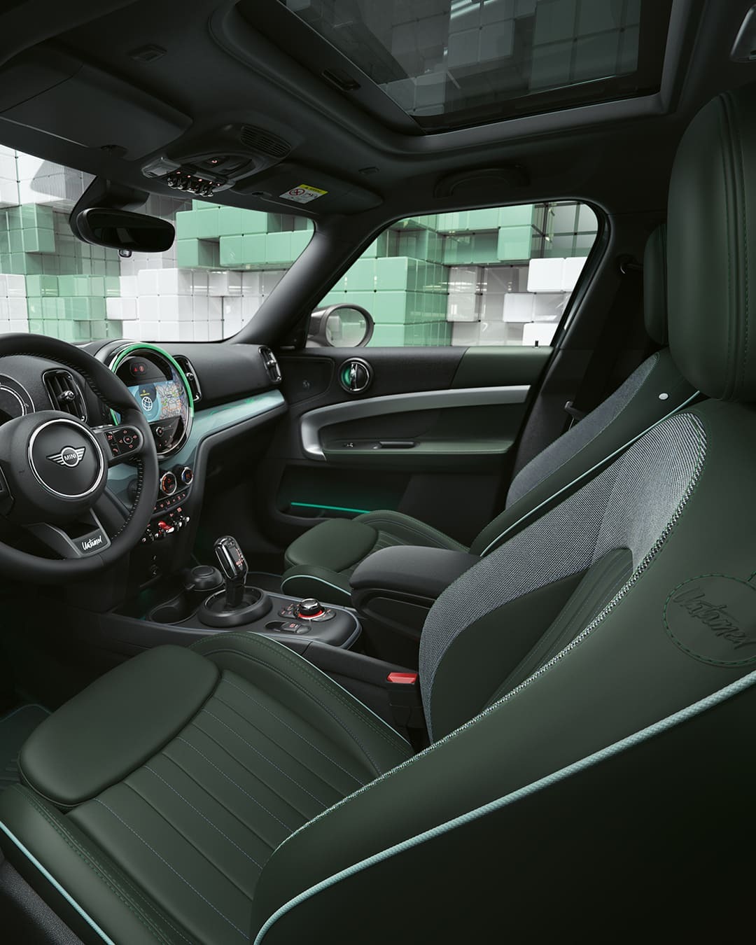 進入座艙空間,沉浸式美學饗宴才正要展開。MINI Untold Edition專屬MINI Yours Lounge真皮內裝採用與車身色調相得益彰的Sage Green搭配藍色對比滾邊與縫線,側邊細膩縫上Untold Edition專屬徽飾,自信彰顯出MINI Untold Edition的無可取代性,舒適乘坐感加上絕美設計,無疑是MINI頂級內裝工藝的最佳體現。