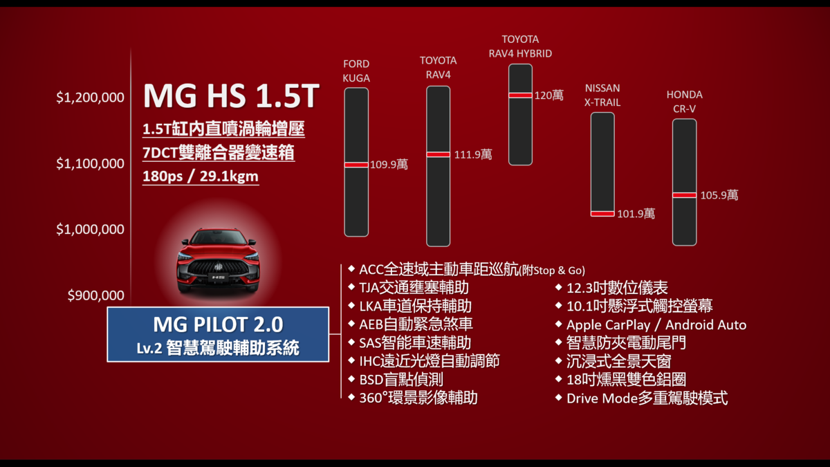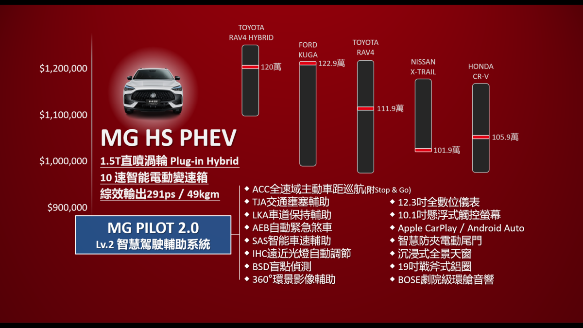MG Taiwan看準近年持續成長的休旅車市場,以及低排量大馬力與新能源之市場潮流,在今日首度亮相在台第一款新車-當家跑格休旅HS車系,以高性價比和出眾的配備水準為訴求,分別推出百萬內超值首選「HS 1.5T」,以及國產唯一PHEV插電式混合動力「HS PHEV」兩種動力編成車款。