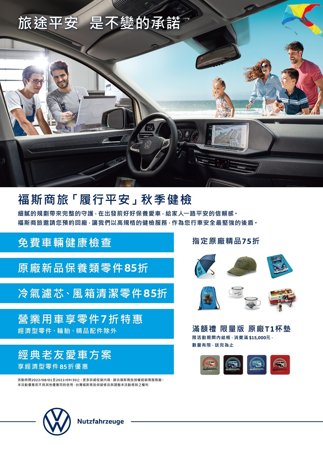 在疫情趨於穩定平緩之際,正逢夏日出遊好時機,為把握享受驕陽時光,相信車主們都迫不及待想要帶著家人一同享受夏日VanLife解悶!讓車主的愛車始終維持在最佳狀態、給全家一路平安的信賴感是福斯商旅的使命,自8月1日起至9月30日止,推出「履行平安」秋季健檢活動,提供免費車輛檢查,再加碼:1.原廠零件特惠、2. 營業用車零件優惠、3.經典老友愛車方案、4. 指定原廠精品優惠、5. 限量滿額禮等五大特惠回饋,帶給車主完整守護,讓出遊安心加倍。