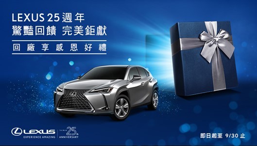 Lexus在台25年來,一直致力於提供悉心款待的貼心服務,帶給每位車主最尊榮待遇,在25週年的重要時刻,也將獻上回廠感恩好禮,以回饋車主長久的支持。8/1至9/30期間回廠保養或維修,即可獲贈Lexus專屬口罩釦與香氛精油組,還有機會抽中UX 200菁英版、tokuyo按摩沙發、和泰Points、yoxi乘車金…等多項驚艷好禮註2。此外,回廠換胎另享全車系輪胎85折優惠,禮上加禮,Lexus誠摯邀請車主共同歡慶在台25週年的喜悅。