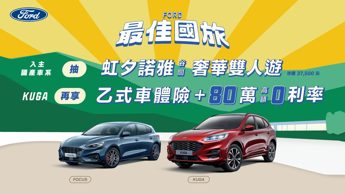 在New Ford Kuga強勢帶動下,Ford國產車系均推出「最佳國旅」限時購車優惠。活動期間2022年8月1日至8月31日止,消費者只要於全台Ford經銷據點完成Ford國產車系任一新車領牌,即可具備台中谷關「虹夕諾雅奢華雙人遊」(市值37,500元)抽獎資格,一舉將人人稱羨、名流們爭相朝聖的頂級奢華度假酒店收入袋。最佳跑旅New Ford Kuga則悏助攻最佳國旅、回饋消費者的滿滿誠意,再加增首年乙式車體險及80萬高額零利率優惠,讓SUV準車主心動入主亳無懸念。