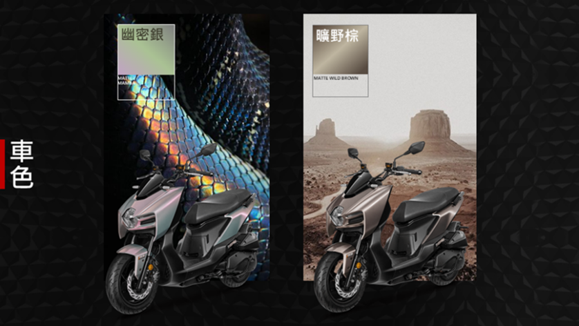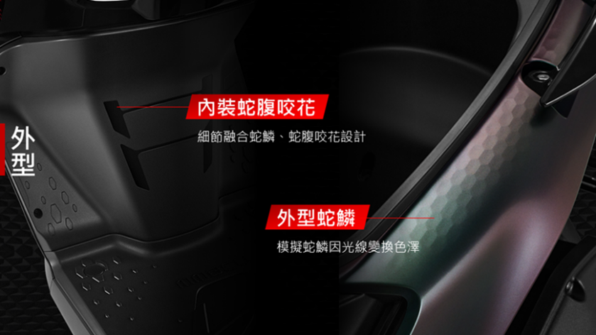 呼應曼巴因應不同的環境有各種顏色,且會因為光線改變蛇鱗會呈現不同的色澤,SYM首次導入多層噴塗工法,在不同光線下呈現不同的色澤。