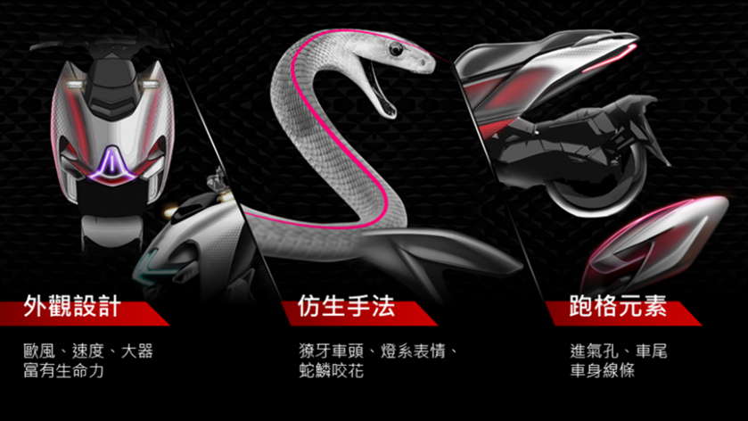 MMBCU結合Mamba曼巴的意象,在車體的細節融合曼巴蛇的生物特徵,車頭呈現曼巴獵食時張嘴時的模樣,並在PP材質上結合蛇腹的咬花紋路,車側兩旁的烤漆件則呈現出立體蛇鱗咬花刻紋,讓MMBCU的細節值感提升。
