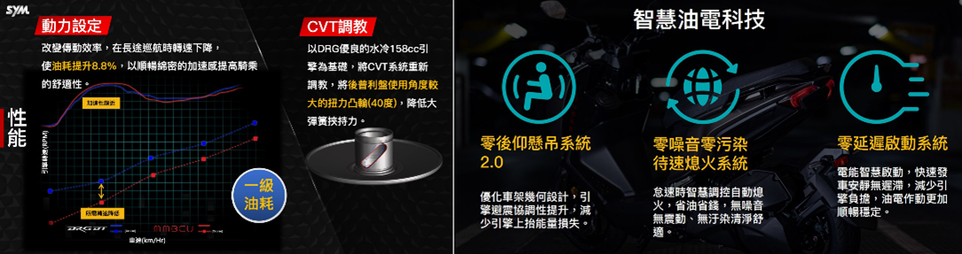 透過CVT傳動設定的調整,讓MMBCU保有充足加速性能的同時,降低各速域的巡航轉速,提生騎乘時的靜肅性及續航力,並且符合能源效率一級油耗的認證。