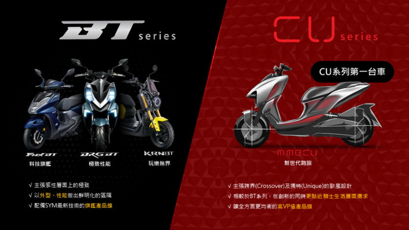 SYM為因應不同使用族群的需求,自2018年起陸續推出BT旗艦系列、Fiddle時尚復古系列、4MICA多功能車款、全新迪爵國民神車等多元車款。為持續滿足不同的消費客群,SYM再推出全新的產品線「CU」系列,分別代表「跨界Crossover」&「獨特UNIQUE」,CU系列除延續SYM的創新精神以外,更加考量騎士生活體驗需求,並結合人因工程、創新、機能平衡的高VP值,帶來更趣味的騎乘體驗。