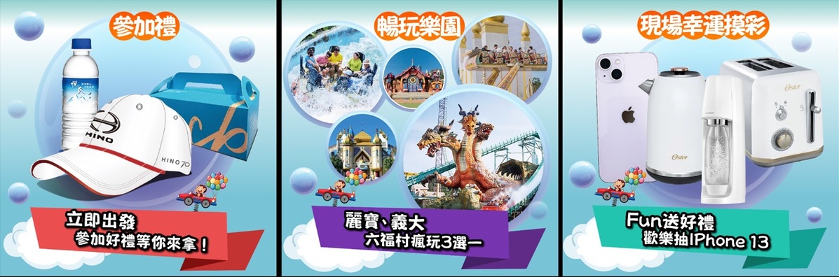 回饋車主的好康還不止如此,凡參與HINO 70 Family Day活動,憑活動手冊不但可兌換HINO 70週年限定紀念帽,三個活動場次都提供50個以上摸彩獎項,讓車主們除了盡情在樂園遊玩、開心享受精彩節目,還有機會把IPhone 13等大獎抽回家!