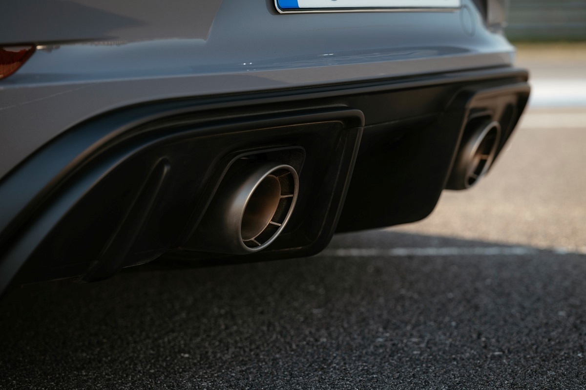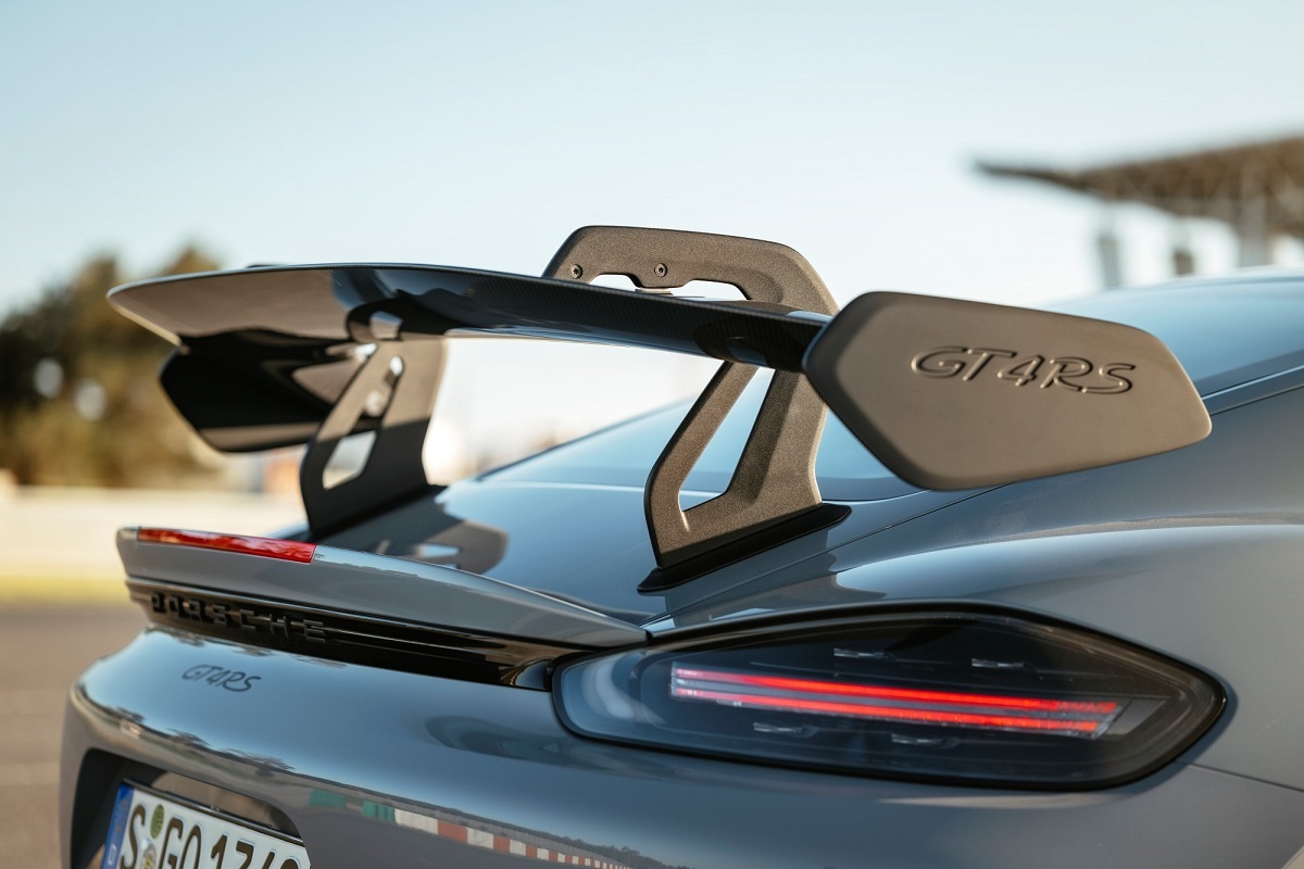 718 Cayman GT4 RS 外觀設計的獨特元素包含了全新擾流尾翼搭配倒勾式(Swan Neck)連桿和鋁合金側翼支架。如此高效能的側翼設計源自保時捷 911 RSR GT 賽車,首次應用於保時捷 911 GT3 系列量產車中。結合與 718 Cayman 相比低 30mm 的行駛高度、前輪拱上引人注目的散熱排氣口、用於優化空力表現的車身底板與後下擾流板,可調節式前擴散器和帶有環繞式側葉片的全新設計前擾流板,使GT4 RS在供賽道使用的性能模式中,產生相較 GT4 增加約 25% 的下壓力。