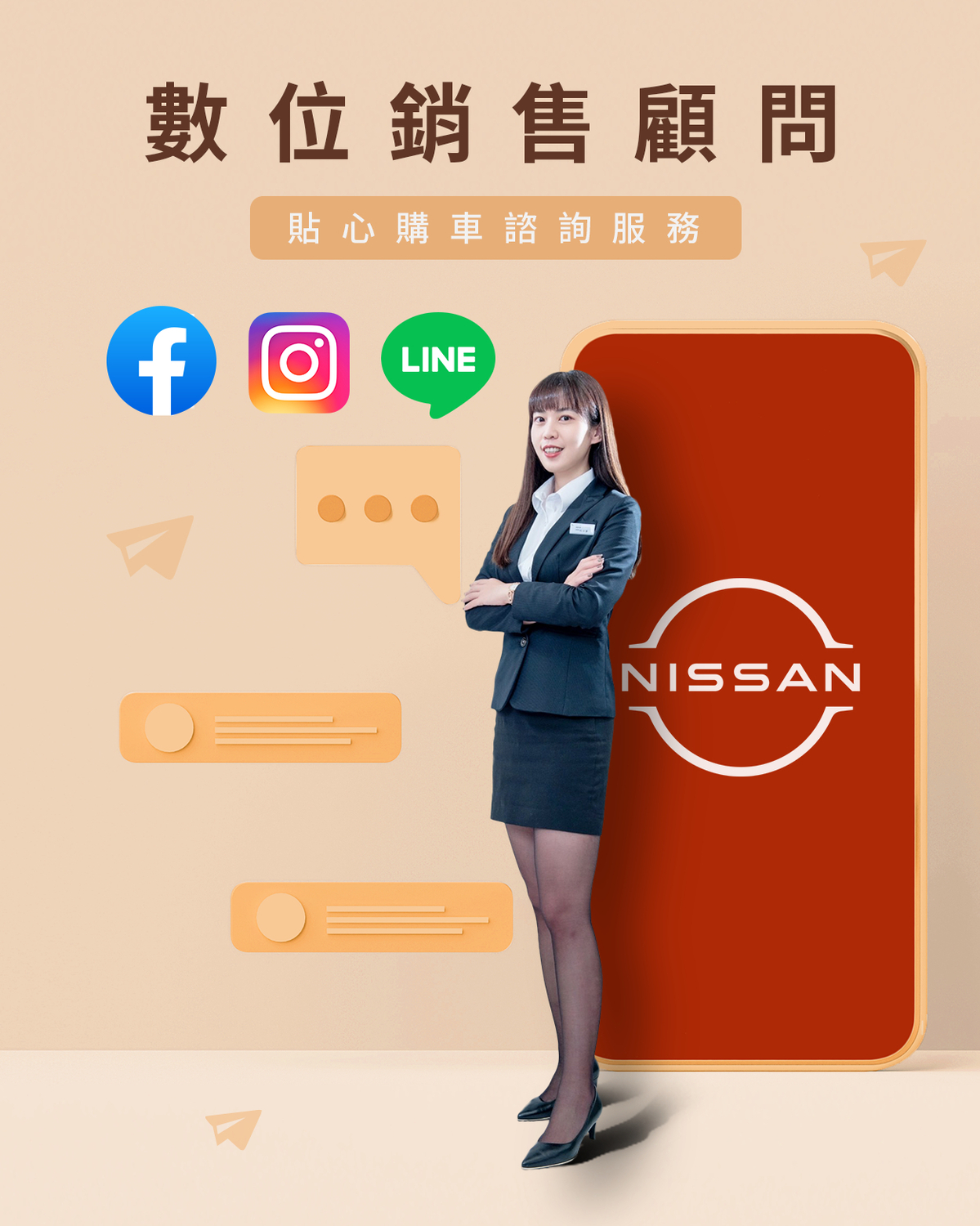 透過NISSAN官網的數位銷售顧問平台,顧客可運用LINE、手機、Facebook或Instagram等多元管道與NISSAN數位銷售顧問聯繫,數位銷售顧問將為顧客介紹NISSAN車款及提供購車優惠訊息,讓顧客在線上就能完整了解所有購車資訊,或安排至NISSAN展示中心體驗賞車或到府賞車與試乘等服務,讓顧客能實際體驗NISSAN車款操駕的樂趣。