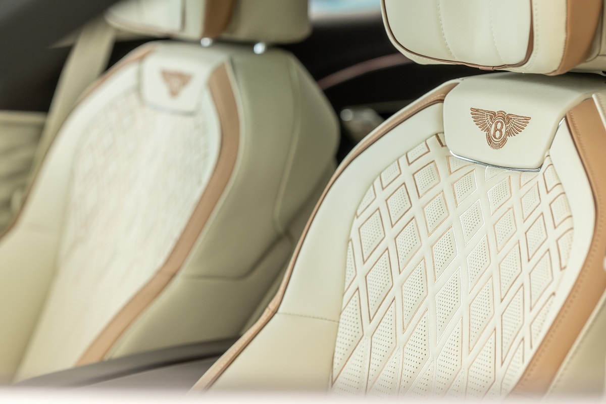 Odyssean Edition專屬內裝採用100%英國羊毛密織而成的花呢材質,可選擇5種皮革配色搭襯亞麻色皮革主調,營造出柔軟溫暖的駕乘感受;椅面更延續EXP 100 GT的特點,以漸層色調縫線交織在全新設計的菱格紋絎縫之中。