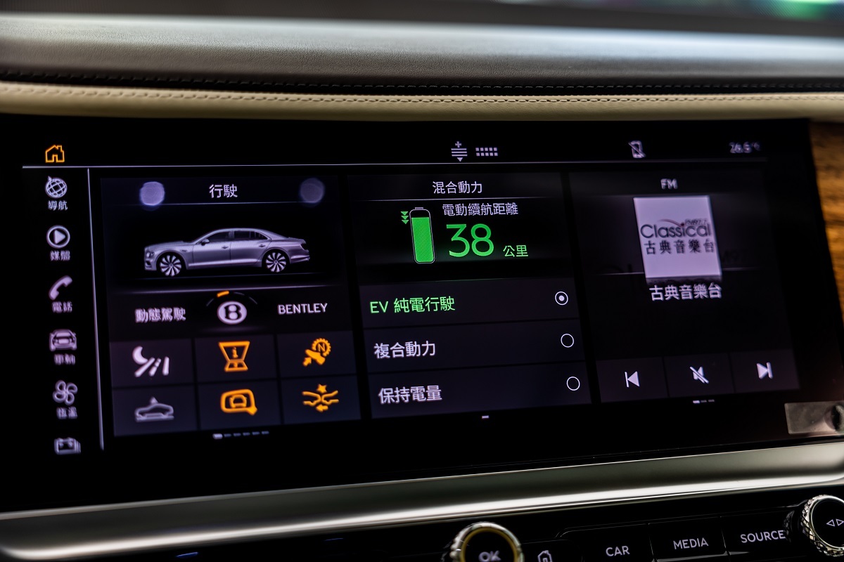 車室內,Bentley令人讚嘆的精緻工藝、典雅材質融合先驅科技,完整傳承至Hybrid車型,全新E Mode切換鈕取代了傳統的怠速啟閉開關,具備EV Drive (EV純電行駛)、Hybrid Mode (複合動力)與Hold Mode (保持電量)三種模式,駕駛可將電能動力做最有效率的安排運用,其中EV Drive (EV純電行駛)為車輛啟動時預設模式,在精緻工藝內裝之中享受純電行駛的優異感受,適合穿梭於市區及短程移動。Hybrid Mode (複合動力)則將行駛里程最大化,配合導航系統以最高效率安排所有驅動方式,甚至可設定抵達目的地時將電量耗盡;Hold Mode (保持電量)預設於Sport駕駛模式下,保留大部分電量作為動力輸出輔助,維持最佳動態表現。