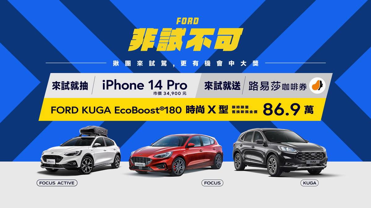 歡慶New Ford Kuga熱銷三萬台,福特六和推出限時優惠,於2022年10月1日至10月31日期間入主New Ford Kuga 180時尚X型,即可享86.9萬元舊換新現金優惠價,人氣車款New Ford Focus/Focus Active也祭出60萬元高額0利率購車優惠;此外,本月福特六和加碼推出「非試不可」活動,2022年10月1日至10月31日活動期間,消費者至Ford全台經銷據點試駕任一車款並上傳社群媒體(FB/IG)分享,即可獲得路易莎咖啡商品兌換卷乙張(數量有限,送完為止),並具備週週抽iPhone 14 Pro抽獎資格。成功邀請2位以上新朋友完成試駕,主揪更享額外抽獎機會,廣邀全台消費者揪團來親身體驗Ford品牌兼具性能與操控穩定性的駕馭樂趣,以及深受美國權威評鑑肯定且在台銷售超過7萬台的Level 2駕駛輔助科技系統。