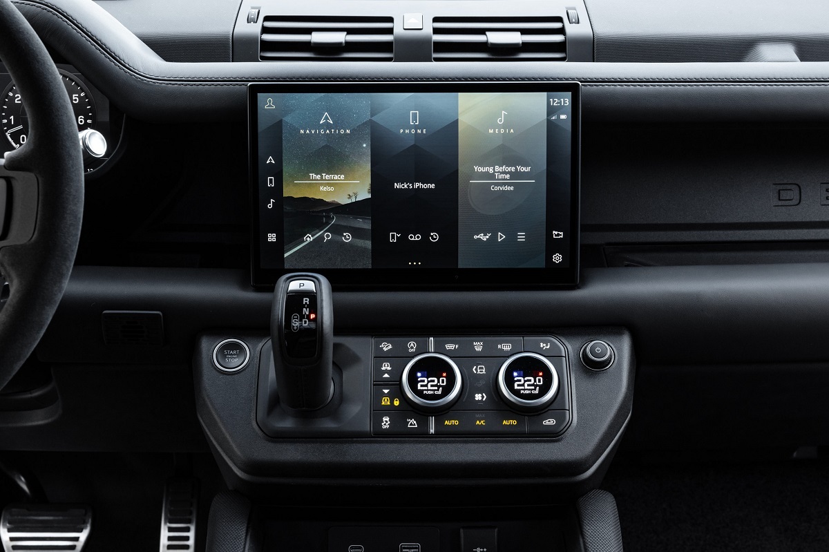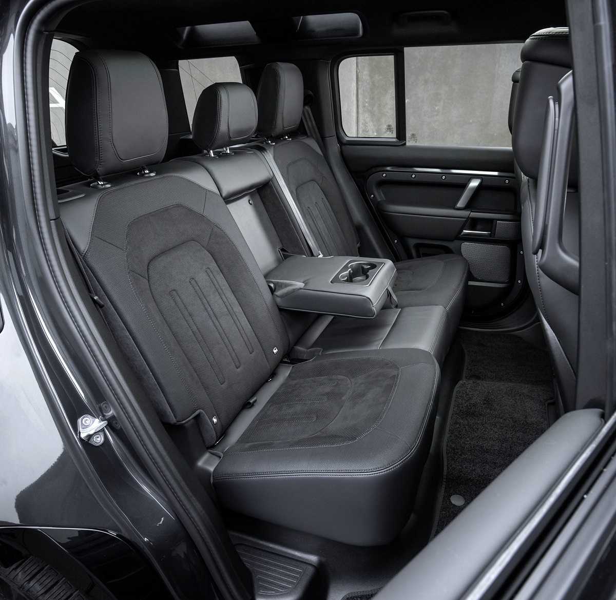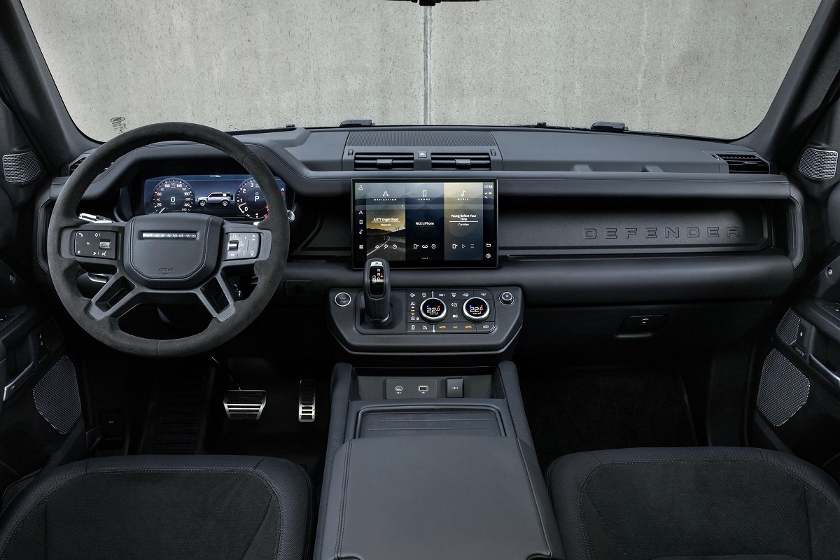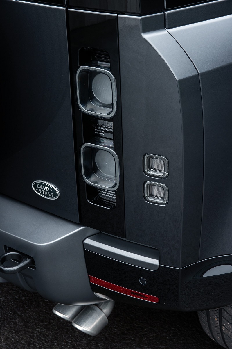 Edition 車色採用深色頂級喀爾巴阡灰金屬漆與緞光防護膜相互搭配,引擎蓋、尾門和車頂則採用亮澤黑與車身形塑對比;配置 22 吋亮黑色鋁合金輪圈與黑色卡鉗,極大化吸引路人目光焦點,全車透過一系列專屬外觀套件,塑造尊爵不凡的王者氣勢。車尾排氣管採用極具性能表率的雙側四出設定,車門兩側下飾板鑲嵌 V8 金屬銘版,為 Land Rover Defender 110 V8 Carpathian Edition 整體車身設計寫下最佳註解。