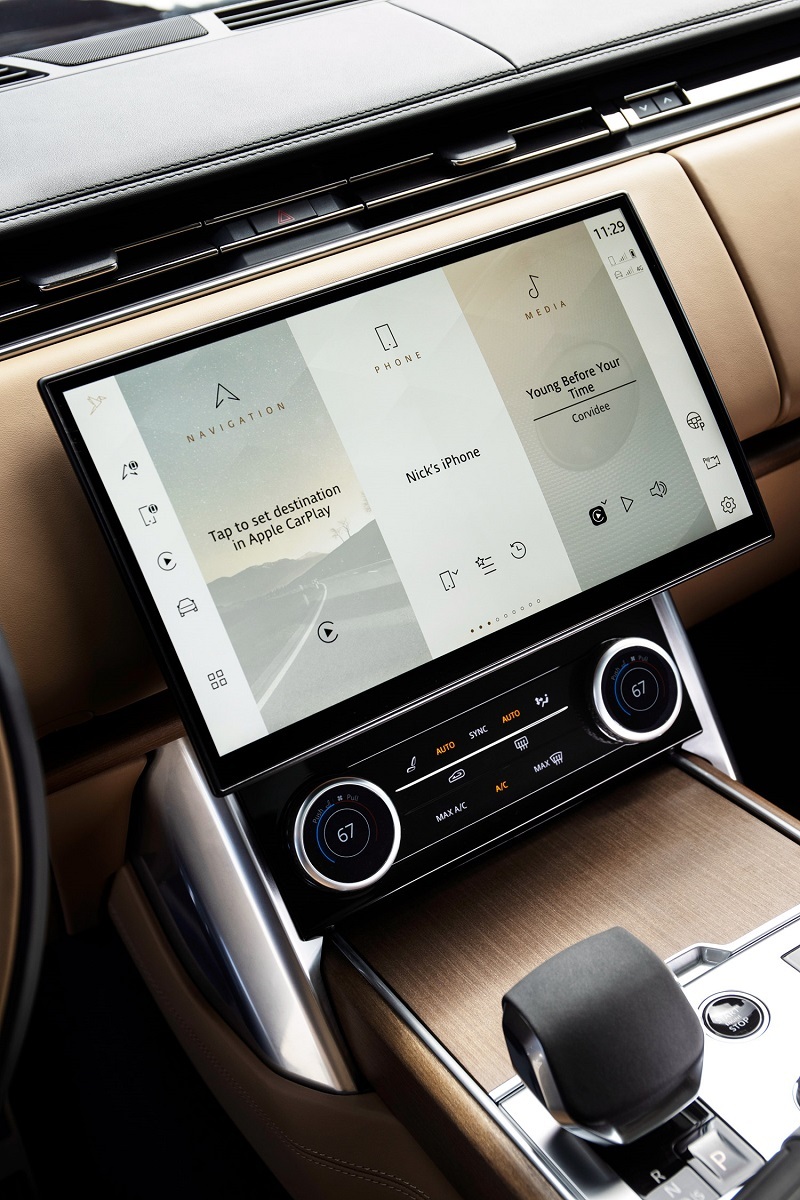 The New Range Rover 搭載多項便利舒適配備與尖端科技廣泛應用,使每趟旅程中的所有成員皆能擁有更為優雅且尊榮的舒適乘坐體驗。前、後車門具備自動吸附緊閉功能,後尾門同樣具電動感應啟閉功能,開關時皆能輕鬆完成;搭載 ClearSight 車內電子後視鏡並具備自動停車輔助功能,即便穿梭於都會之中,仍提供駕駛人十足的駕駛信心。進入車內,中控台採用全新的 13.7 英吋全數位化 HD 懸浮式儀錶板與 13.1 英吋曲面觸控螢幕組成,搭載 Pivi Pro 多媒體影音娛樂系統,清晰整合完整車輛資訊;同時,曲面觸控螢幕擁有觸覺回饋功能,使駕駛員更能精準操作車輛設定,系統兼容無線 Apple CarPlay® 與 Android AutoTM,提供多元且全面的資訊輔助。全車資訊系統擁有多達 70 個模組可透過 SOTA 進行線上更新,使車輛隨時保持在最佳狀態;結合手機無線充電、車前抬頭顯示器等便利配備,提供更為輕鬆愜意的駕駛體驗。