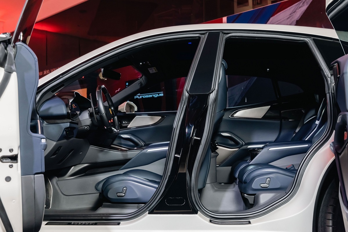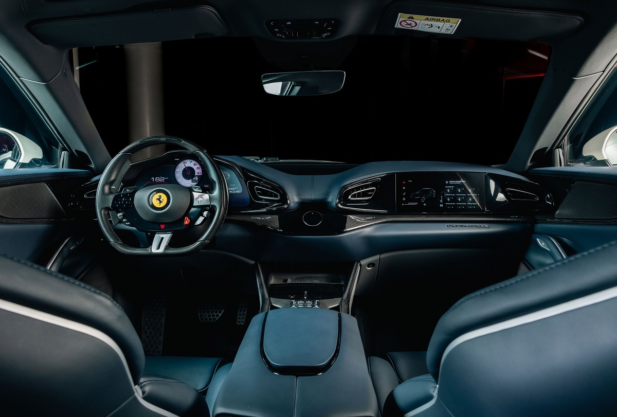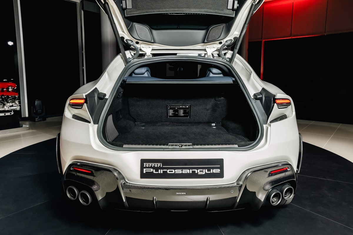 在設計上,法拉利設計師們從零開始設計車身架構,其全新車架配置了碳纖維材質車頂,達到減輕重量並降低重心的目標。其中一大創新的設計亮點為引入後鉸鍊式後門,又稱作「歡迎門」,此設計提供新車在維持緊湊車身比例的同時,讓乘客進出時更加輕鬆便捷。在新車座艙設計,配備了四個附有加熱功能的全電動座椅,可為四名成年人提供優異的支撐力及舒適的乘坐空間與體驗。在空間機能上,新車擁有法拉利史無前例的大容量後車廂容量,後排座椅更可折疊以進一步增加後車箱空間。而相較其他躍馬跑車,Ferrari Purosangue儘管擁有更高的駕駛位置,但其構造及設定與其他躍馬跑車並無區別,駕駛位置依然盡可能貼近地面,讓駕駛者能夠依然直觀的感受車輛的動態性能。此外,新車也標配豐富的舒適性配備,例如Burmester © 音響系統,以及從認證再生聚酯中提取的全新Alcantara®內飾材質等諸多可選配備。Ferrari Purosangue在性能、設計、駕馭樂趣及舒適性上,再次完美樹立同級距市場中四門四座跑車的全新標竿!