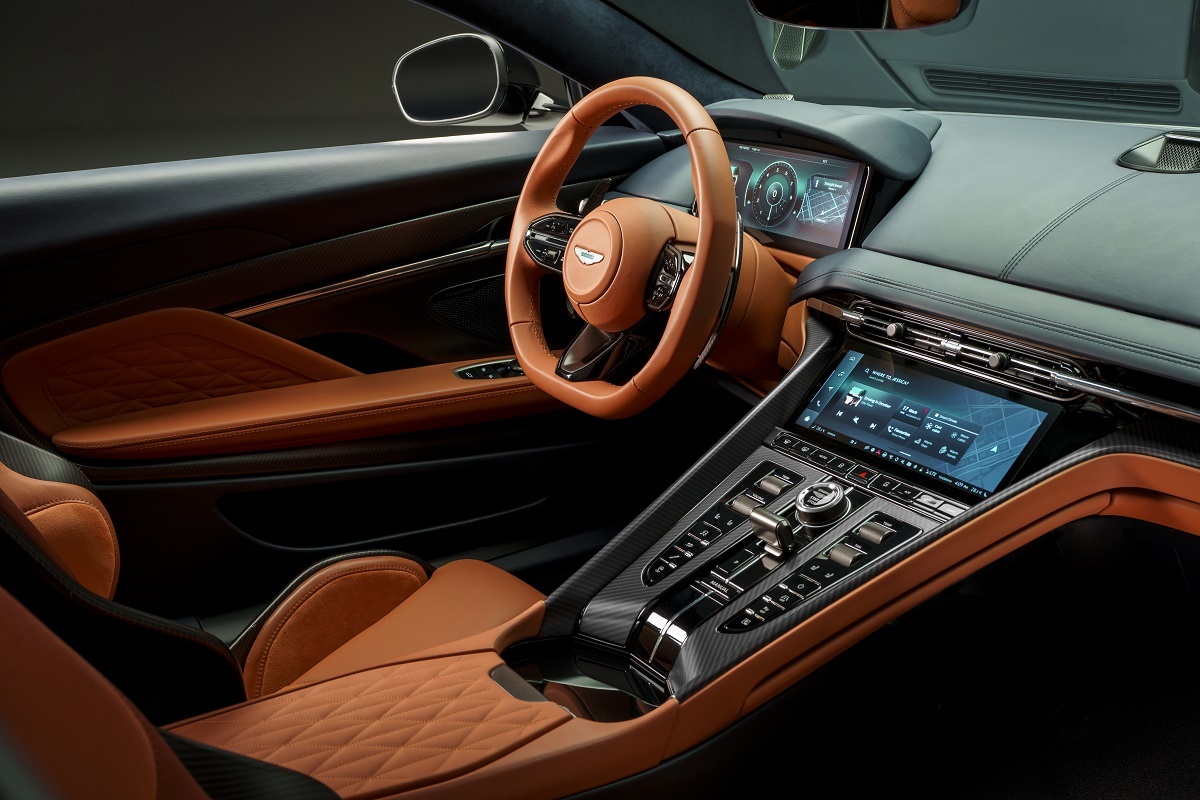 DB12 的內裝將當代設計與經典工藝完美結合,著重於以駕駛為中心的安排,巧妙將科技及奢華材質融入日常使用中,控制按鈕沿內裝中心線由上而下分佈,符合人體工學,確保提供駕駛者最流暢的使用介面;而車艙內乘坐者位在車輛肩線之下,配合高聳的中控檯,提供沉浸式座艙體驗。