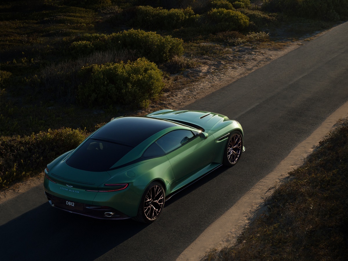 DB12 前軸加寬 6 mm、後軸增加 22 mm 呈現更具肌肉線條的車身,車身鈑件下卻蘊藏著強大動力輸出,全新的車頭設計具有更大的中央水箱護罩和左右進氣孔。新式無邊框後視鏡與外觀相得益彰,並優化了空氣力學表現。身為一輛撼動人心的劃時代之作,引擎蓋上最引以為傲的 Aston Martin飛翼廠徽是品牌最新識別,也是首輛搭載全新廠徽之車款,象徵 Aston Martin 新時代的開啟。