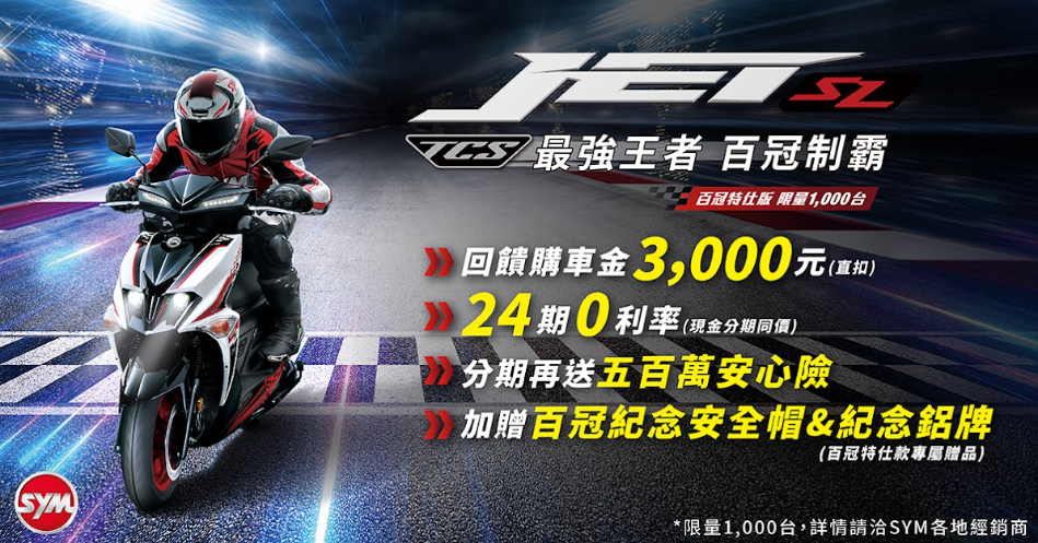 自2015年拿下第一座冠軍,JET八年來征戰全國各級比賽,一直是速克達賽事的常勝軍。每一代的進化不斷提升,在動力、操控、科技上持續的突破自身極限,終於在今年4月的首場TSR賽事成功寫下歷史,拿下第一百座冠軍獎盃。為了將這歷史性的一刻與車友們一同紀念,SYM特別邀請歷年來的冠軍車手齊聚一堂,舉辦了一場冠軍友誼賽,回顧初期披荊斬棘的奮鬥及後期稱霸賽道的榮耀,冠軍們都肯定JET SL是台能讓他們奪冠的好車。為慶祝百冠成就達成,SYM以自家廠隊「Start Your Miles」的車體彩繪設計,推出JET SL TCS百冠特仕版,以限量1,000台的形式販售,讓支持機車運動賽事的同好,一同感受百冠車款的極致性能與賽道熱血。