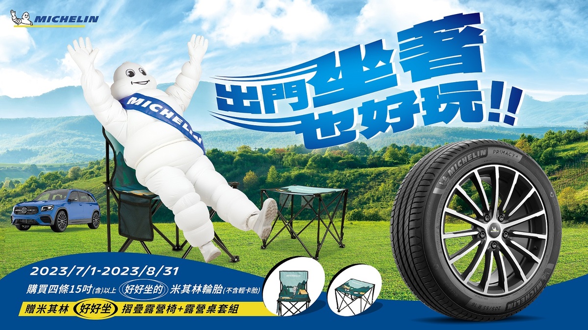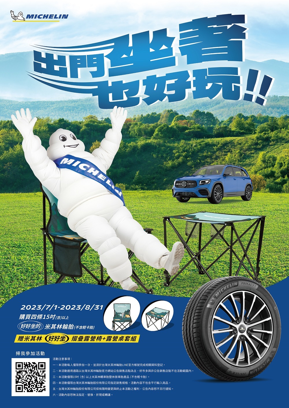 台灣米其林始終致力於為消費者提供安心出遊的保障,確保在道路上的安全可靠與輪胎持久性,憑藉著卓越的品質和創新技術,已成為眾多車主的首選,更在今年五月導入米其林高性能電動車胎PILOT SPORT EV與PRIMACY 4 +胎款,提供全方面的解決方案,持續佈局台灣市場多元化的輪胎產品,力求滿足消費者的多樣需求。因應現代人的忙碌生活,台灣米其林推出夏日獨家優惠「出門坐著也好玩!」,7月1日起至8月31日,凡至台灣米其林輪胎官方網站公告銷售店點,購買四條15吋(含)以上的輪胎,即享米其林客製「好好坐」摺疊露營椅+露營桌套組,敬邀消費者一同「放膽閒閒沒事坐!」,「坐」出愜意好心情,出門安心、玩得開心,徹底享受放鬆悠閒的安心時刻,讓米其林輪胎優異持久的絕佳性能,成為心情轉換的首選良方。