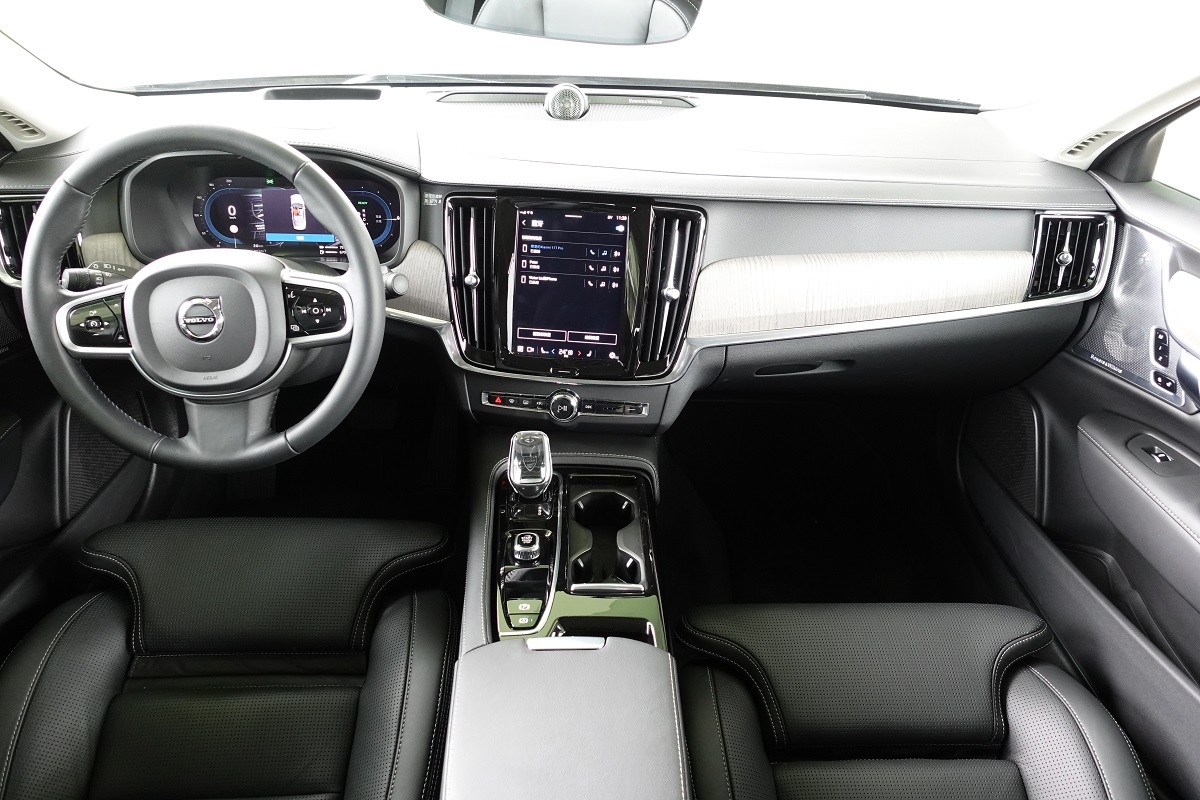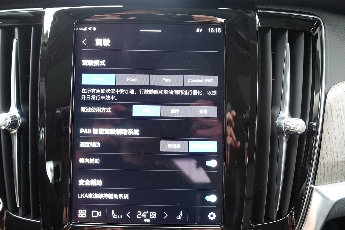 Volvo S90 T8 Inscription搭載了一套強大的混合動力系統,由2.0升四缸渦輪增壓引擎和前後軸雙電動馬達組成。搭配電子四輪傳動系統,綜效馬力達310匹,最大扭力達40.8公斤米,0-100km/h加速只要4.8秒,在中低速溫和行駛下,純電行駛里程可達86公里,平均油耗可達52.6km/L,提供了卓越的加速性能和燃油效率。電動馬達則為車輛提供了純電動模式,讓駕駛者在城市環境中享受靜音和零排放的駕駛體驗,如果是每天短程的通勤加上家中上班地點的慢充,一個月不加油的狀況絕對是可能的。