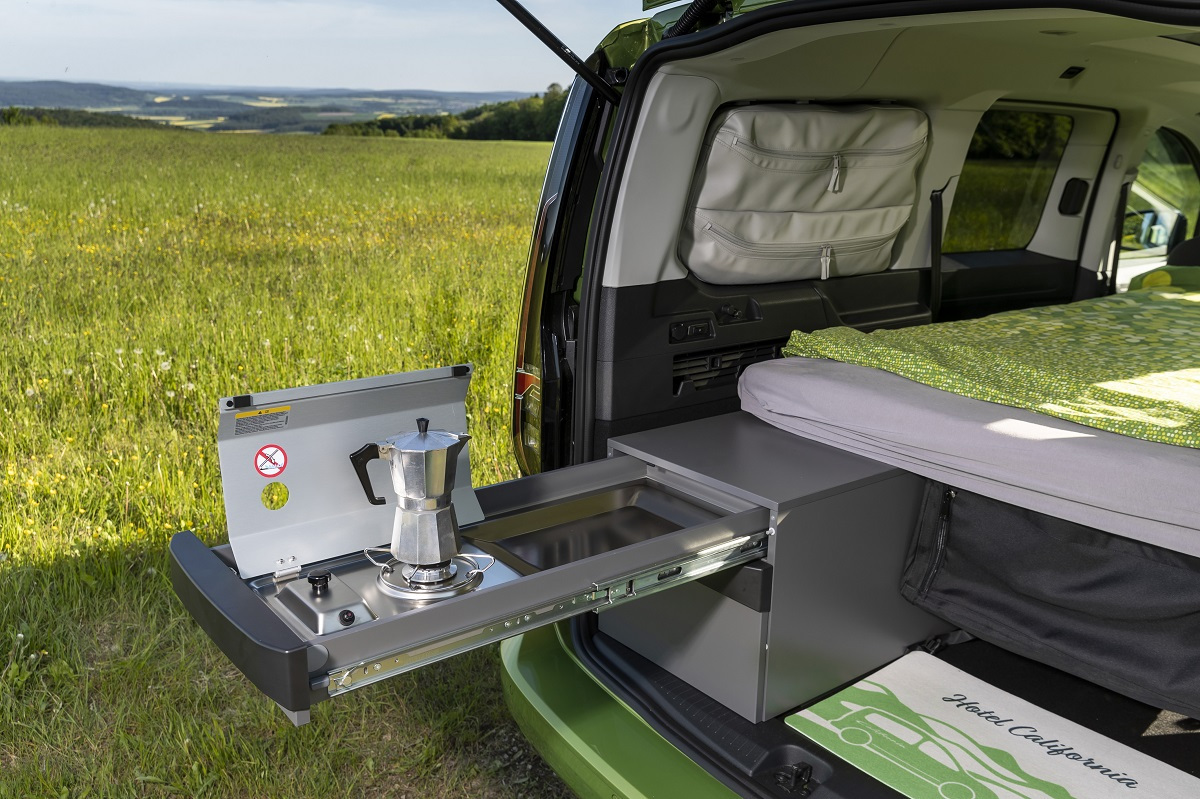 福斯商旅Caddy California是國內唯一中型休旅格局所打造的入門MPV露營車款,提供完整California專屬露營配備,包含:出遊必備的「伸縮式車側遮陽棚」、便利收納的「隱藏式戶外摺疊桌椅」,亦可選配提升舒適空間的「全景玻璃車頂」,打造無阻礙的環境視野與家人共享大自然之美;車室內裝則以實用機能設計為導向,標配符合人體工學的「碟型彈簧床架」,搭配舒適「雙人摺疊臥鋪」,帶給家人如同家一般的舒適體驗;另配置露營車必備的「環艙遮陽簾」、「遮光置物袋」、以及「通風換氣紗窗」,不僅可保持車內通風確保空氣清新,更是讓乘員安穩入眠的絕佳配備;同步搭載LED臥艙閱讀燈、LED尾門照明燈、230V歐規插座,全面給予VanLifer車主舒適便利的用車環境。同時,為讓玩家們享受輕鬆愉悅的車居生活,更具備獨一無二的行動迷你廚房「隱藏式流理台」,包含單爐烹飪瓦斯爐及餐具置放儲物區,整合於車身設計讓戶外生活更輕鬆愜意。