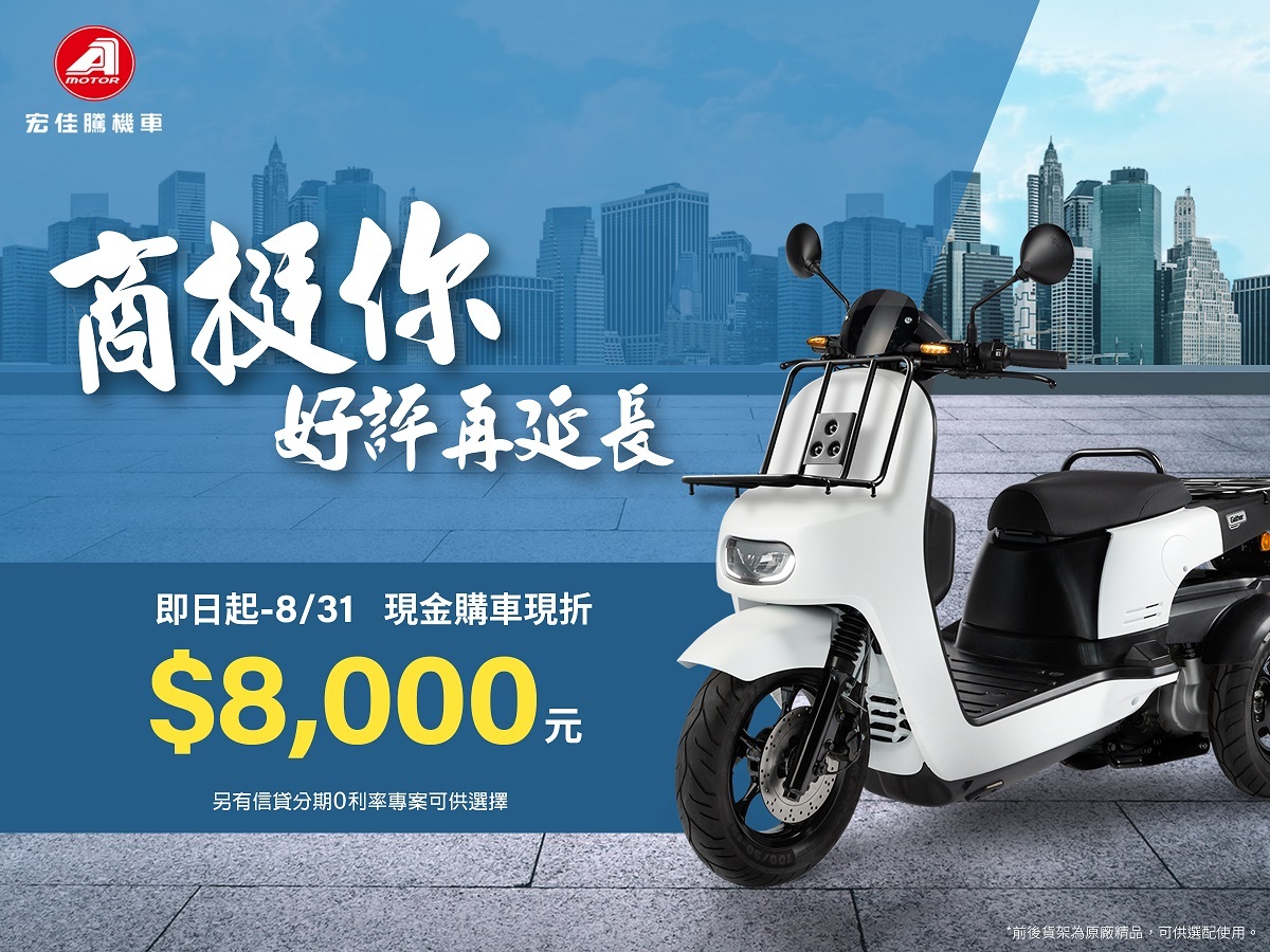 優惠自由選」方案至8/31,讓你享信貸12/24/36期分期0利率,或是現金購車$8,000元購車金,方案二選一,再搭配政府購車最高補助$6,300元,最多現省$14,300元,讓宏佳騰成為你強大的工作後盾,與你並肩前行。