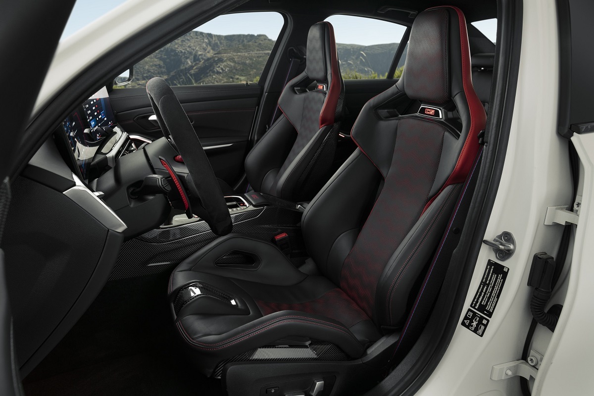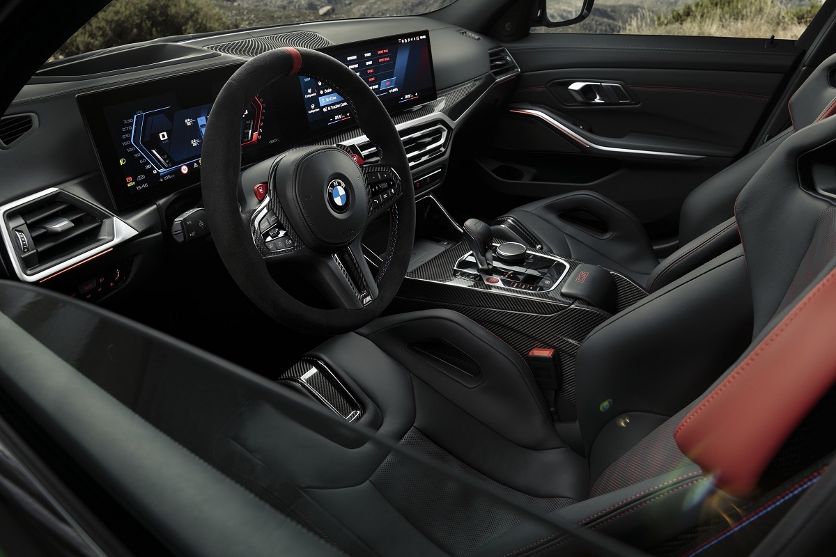 同樣以紅、黑配色的車室空間使用Full-Leather Merino全真皮內裝,為充滿熱血M語彙的駕駛座艙增添豪華精緻的頂級質感。M碳纖維賽車桶型座椅包含專屬CS發光字樣,除了提供駕駛安全穩定的保護及增加激烈操控時的靈活反應,同時擁有加熱與電動調整等實用功能。Alcantara麂皮材質M多功能方向盤搭配12點鐘位置標記、碳纖維換檔撥片及M碳纖維飾板,點燃駕駛對於激情與速度的熱切渴望。忠於駕駛導向的懸浮式曲面螢幕由12吋虛擬數位儀錶及14.9吋中控觸控螢幕組成,搭配BMW M專屬介面的BMW OS8系統及M車況抬頭顯示器,清楚且即時地呈現駕駛所需的各項資訊。為使極致性能與日常生活完美融合,全新BMW M3 CS標準配備多項主動安全系統、停車輔助系統、電動行李廂啟閉系統及harman/kardon高傳真音響系統,提供車主更全方位的防護與便利舒適的駕馭模式。