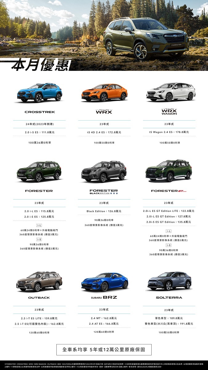 1. Forester、Outback、Crosstrek、WRX、WRX Wagon、BRZ、Solterra促銷方案須於8月1日起下訂,且於8月31日前完成領牌適用。