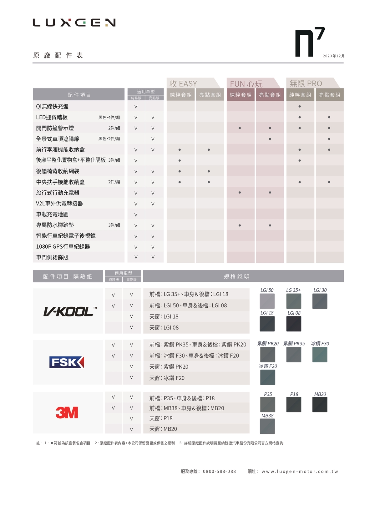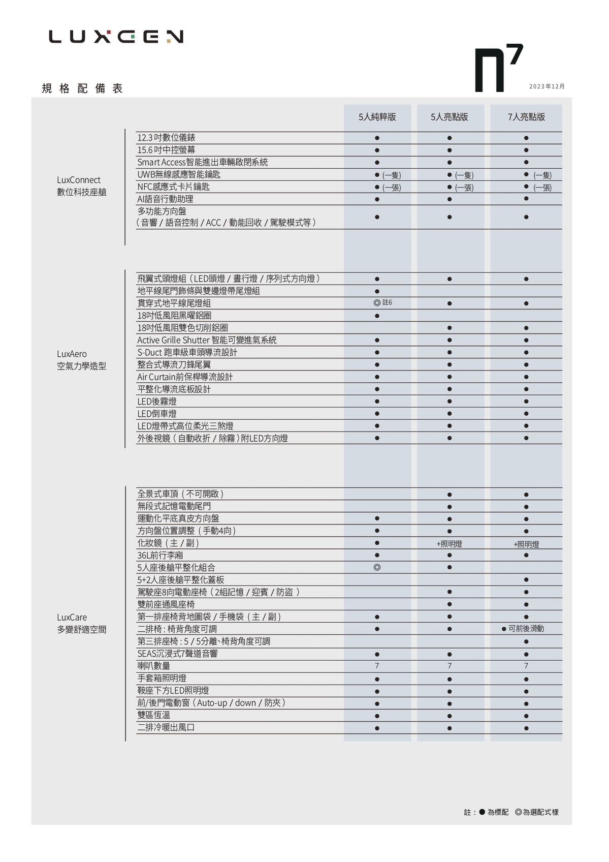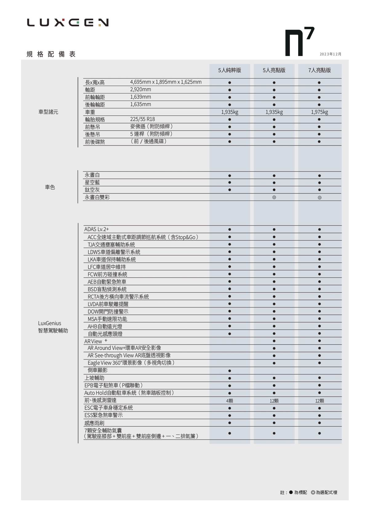 《PURE for all純電未來藍圖》的肯定與支持,為了兌現讓台灣電動車普及化的目標,將以更親民的價格、超越車的移動體驗、會員專屬的一站式服務平台,讓燃油車消費者能無痛轉移電動車。LUXGEN於今日(12/27)在車展前正式公佈了n7完整規配表、原廠配件表與2024年全新售價:5人純粹版109.9萬元、5人亮點版129.9萬元、7人亮點版134.9萬元,更對2023年預購會員加碼提供亮點版專屬2萬元回饋金(純粹版車主可於配車前隨時於線上改選亮點版,同享此優惠)。為了提供消費者更精緻的服務體驗,LUXGEN未來新能源車系將採會員限定的銷售與服務模式,初期除了最優先服務超過1萬位已預購會員外,也將再陸續開放2.5萬純電會員中尚未參與首波預購之消費者來店體驗與購車,一般大眾則須待明年Q2後,才有機會透過參與新的會員專案始能獲得購車資格,建議目前有意入主純電未來的消費者可以先至官網註冊成為LuxClub會員,第一時間掌握會員專屬訊息。