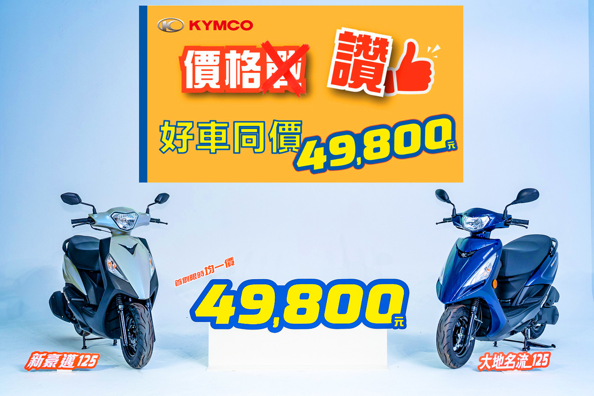 真心回饋消費者就是價格「讚」!兩大國民神車聯手「首創限時均一價49,800」只到3月底!KYMCO針對「首創限時均一價」活動期間從3月1日至3月31日,想要輕巧省油的代步小幫手就選新豪邁 125、需要能一起打拼的堅實後盾就買大地名流125,消費者絕對不要錯過,即刻至KYMCO全台經銷店點購買!