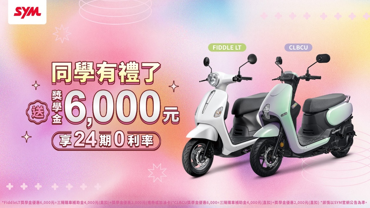 獎學金優惠6,000元=三陽購車補助金4,000元(直扣)+獎學金優惠2,000元(禮券或加油卡)