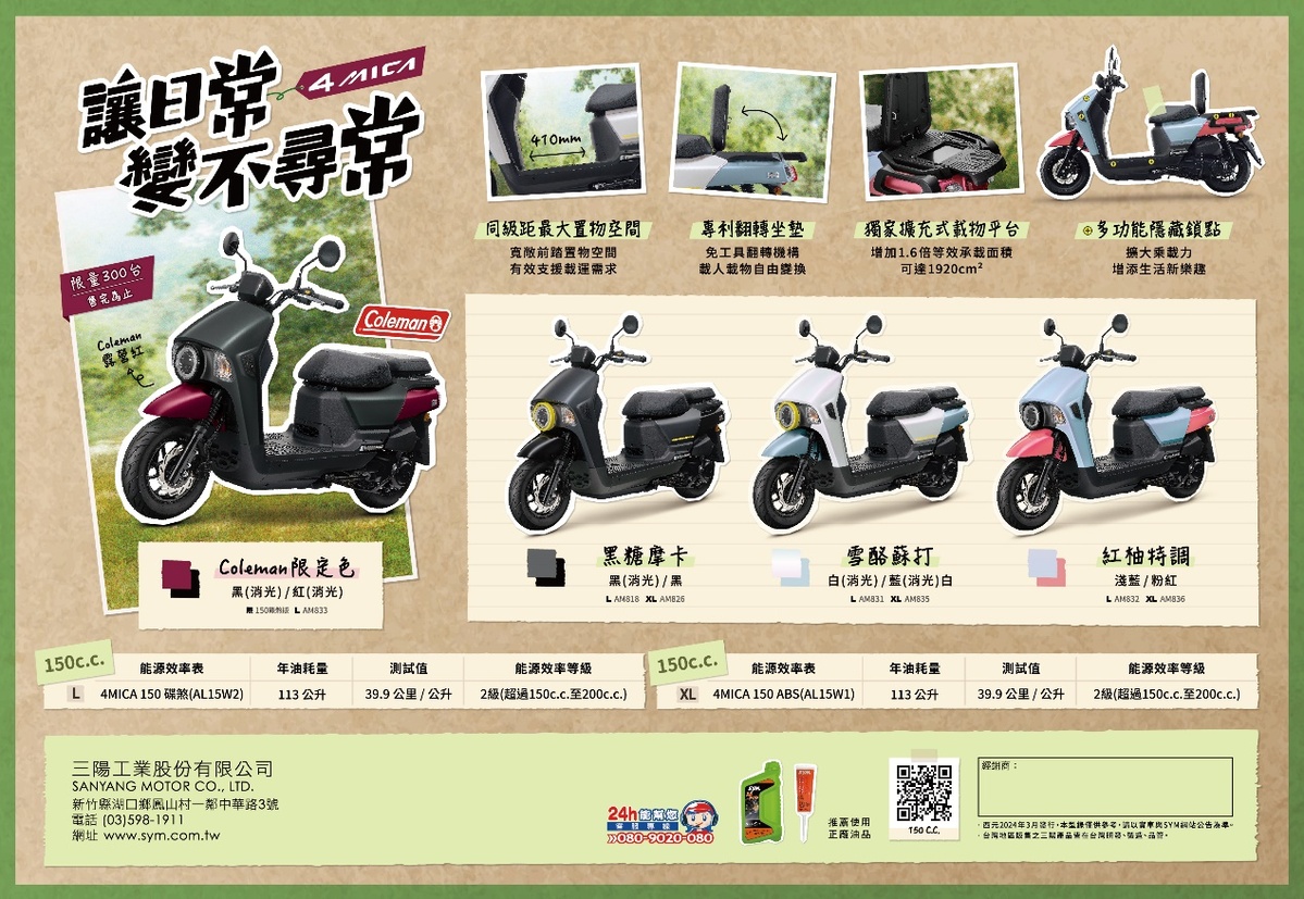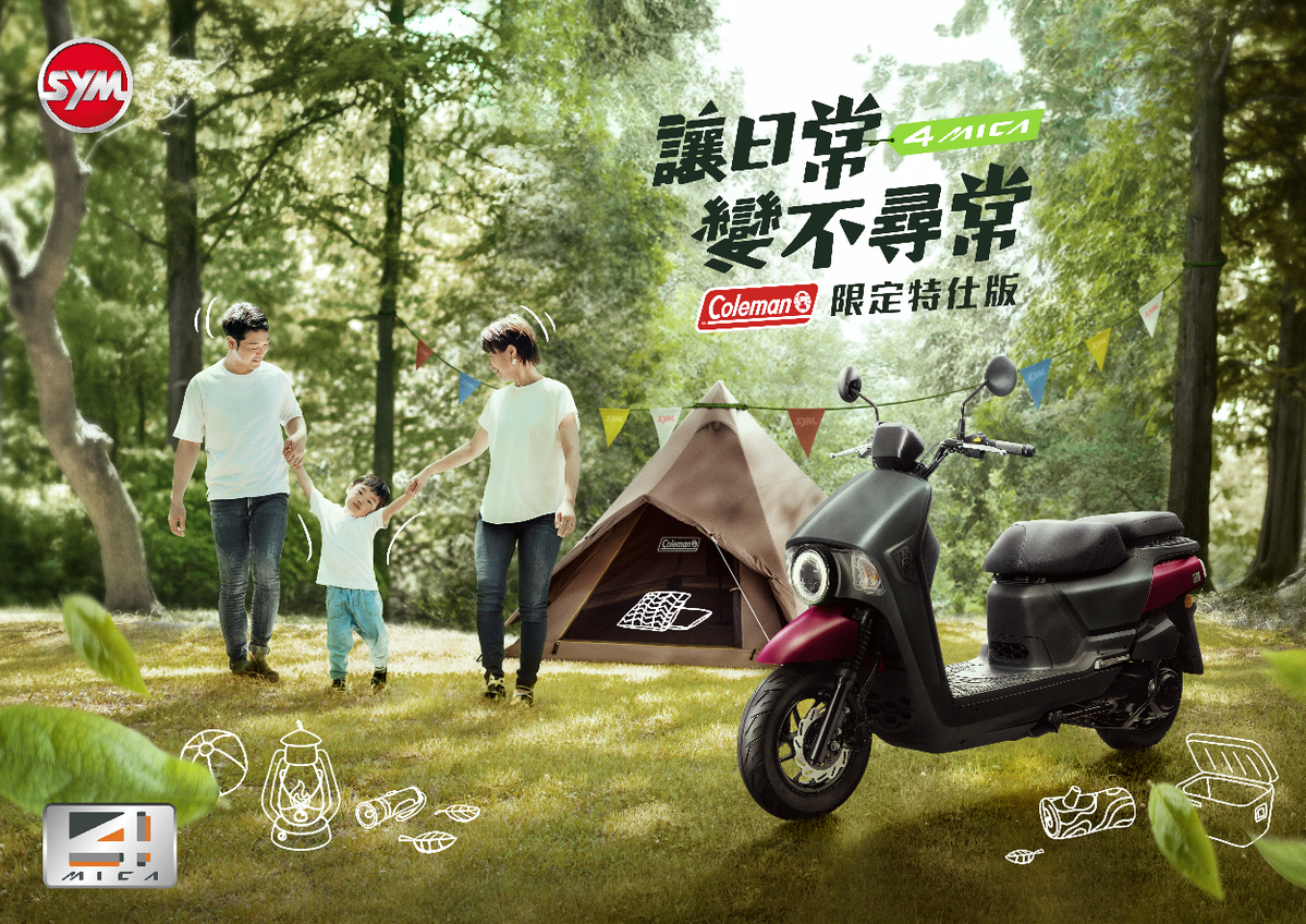 4MICA本次推出的Coleman特仕版,車色參照Coleman LOGO用色來發揮,增添車款的戶外風格感。不只外型,車款的多功能鎖點可依據需求能隨心增加乘載空間;同級最大寬敞置物空間,讓同時有大量載物載人需求的車主,不再需要二選一;專利翻轉坐墊加成獨家擴充後平台,讓生活型態自由轉換更加便利,除了可以一車擔起承載力,也顧及用車安全性,預先設想車輛載重、用車情境,搭配雙黃警示燈、LED頭燈、後輪手剎車,讓你便利又安心騎車,車款貼心設計囊括生活中各種情境,平日陪你打拼照顧家庭、假日陪你上山下海實現個人想望,4MICA創造機車與生活的多種可行性。