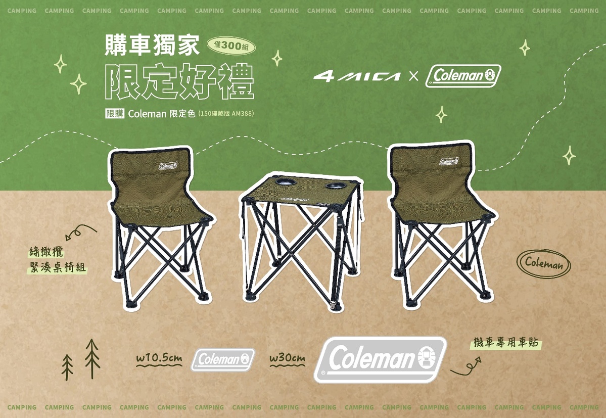 4MICA首度與戶外休閒用品的經典品牌Coleman合作,在熱愛戶外活動者心中Coleman具有極崇高的地位,在產品設計上實用兼顧質感,是許多入門者及老手心中的夢幻逸品,同4MICA有好看的外貌也內含實力。此次4MICA x Coleman合作特仕版全台限量300台,購車即贈Coleman緊湊桌椅組(市價2,500元)與Coleaman LOGO車貼(兩項皆限300組),讓大家享受騎車樂趣同時也創造戶外體驗的美好回憶。