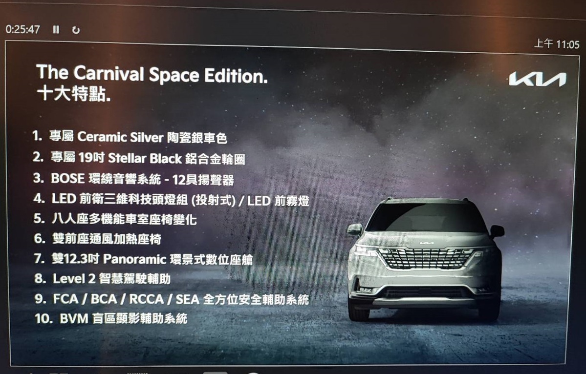 Technology前瞻科技」三大產品DNA,以現行The Carnival尊貴八人座車型為基礎,並升級多項頂級配備。外觀以全新專屬車色「陶瓷銀」,配上獨特的19吋Stellar Black鋁合金輪圈,打造深具個人特色的獨特風格,並搭配頂級車型標配的投射式LED前衛三維科技頭燈及LED前霧燈,更突顯其時尚科技感;內裝部分,The Carnival Space Edition使用黑灰雙色打造沉穩大器的車室氛圍,並升級原本頂級車型獨有的12支揚聲器BOSE環繞音響系統,提供尊榮的影音享受。The Carnival Space Edition搭載12.3吋整合智慧型全數位儀表板,搭配12.3吋多媒體影音觸控系統,打造出Panoramic環景式數位座艙。此外,雙前座搭載8向電動可調式座椅,並具有通風和加熱功能,提供更加尊榮款待的舒適駕乘體驗。
