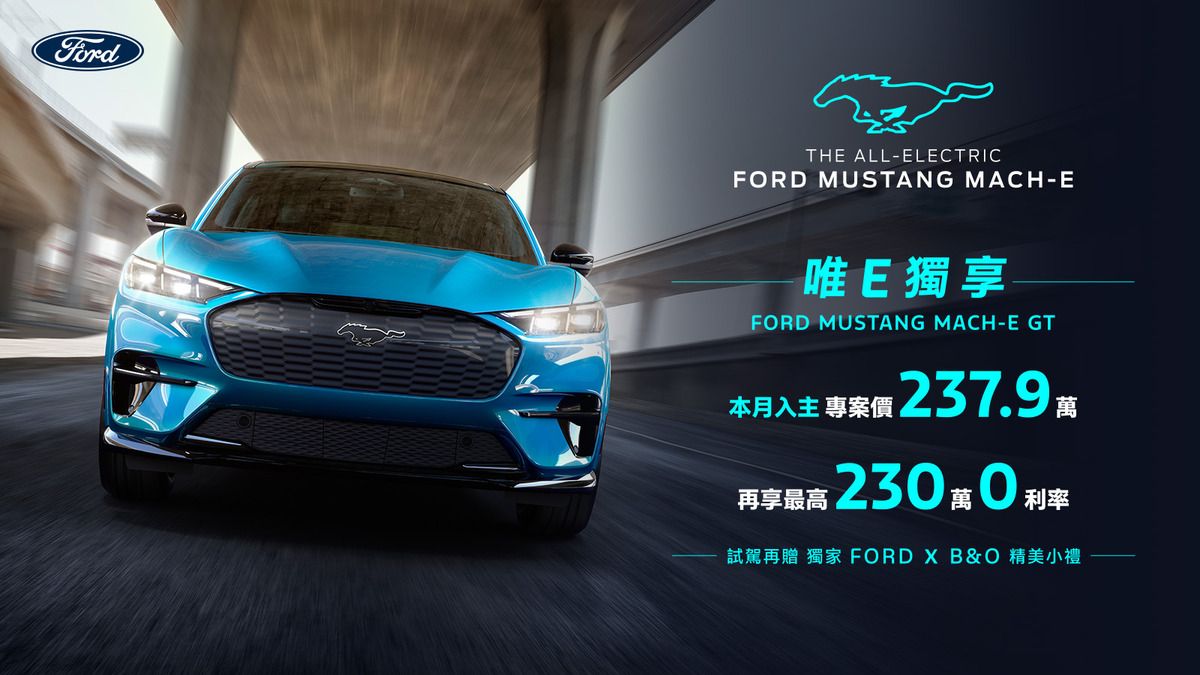 2024年6月1日至6月30日止 - 入主享專案價:Select車型179.9萬元、Premium車型220.9萬元、GT車型237.9萬元 - 優惠貸款:入主Premium車型享最高200萬45期0利率;GT車型再享230萬55期0利率優惠 - 現任Ford Mustang Mach-E車主推薦親友入主Ford Mustang Mach-E,將額外獲得5,000元充電金 - 本月全車系試乘享Ford x B&O精美小禮 |