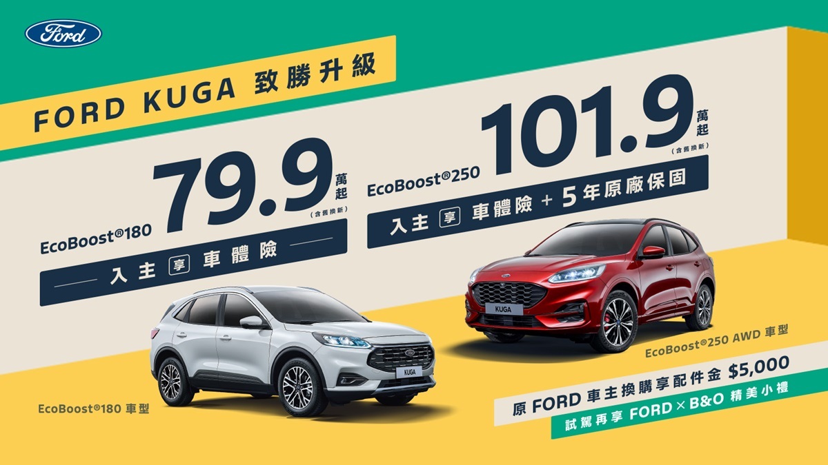 New Ford Kuga尊榮專案好評加碼,本月入主New Ford Kuga享專案價EcoBoost®180車型79.9萬起(含舊換新)、EcoBoost®250 AWD 車型101.9萬起(含舊換新),全車系再贈送丙式車體險,EcoBoost®250 AWD 車型再享五年原廠保固 ,敬請消費者把握機會入主,本月來店試乘指定車款再享Ford x B&O精美小禮。