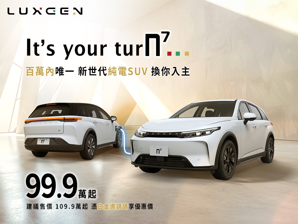 It’s your turn⁷!這次換你開n⁷!感謝消費者對LUXGEN的支持,截至6月底LuxClub尊榮會員已累積突破三萬人次,大家熱烈的支持也使得試駕預約名額爆滿,造成尊榮會員們有可能來不及在當月完成試駕,為此我們特別回應大家的反饋,將滿電特仕版的下訂期限延至7/31,並盡可能的加開試駕場次,希望讓大家都能在選購前對n⁷有美好的體驗。回顧2022年LUXGEN新起點活動以來,首次啟動招募一週內即吸引2.5萬會員繳納千元獲取n⁷ 購買資格;2023年會員搶先下訂活動短短12天內即收到超過8000筆訂單;2024年6月會員招募再開又在一個月內新增了5000位尊榮會員,讓新世代LUXGEN的新會員數累積突破三萬大關,為了感謝全民一而再、再而三的熱情支持新世代LUXGEN 朝新能源品牌轉型,並呼應政府近期所提出之「形塑淨零永續綠生活」的台灣願景,LUXGEN特別不計成本宣布:7月起憑車主專屬的白金邀請碼入主建議售價109.9萬的5人純粹版回饋價只要99.9萬,滿電特仕版充電回饋也從原本的20%加碼為30%!身為台灣自主品牌,LUXGEN肩負著台灣綠色移動創新者的使命,為加速新能源交通普及、降低普羅大眾進入門檻,我們深知唯有透過國產電動車共同擴大電動車口數,才能真正讓新能源生態系越趨完整,讓每一個想要入主新世代純電休旅的台灣消費者都能以百萬內的價格輕鬆邁出第一步!LUXGEN的新能源產品價格將依市場策略、原物料成本變化等因素隨時動態調整,敬請把握當下最實惠的價格入主純電未來。