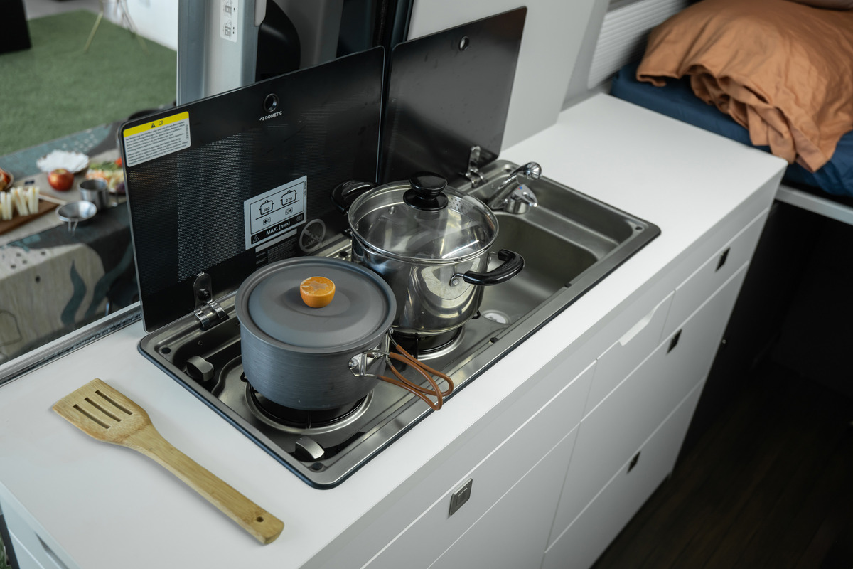 三、多元完善的「廚房區」:配置70 公升三層抽屜式多層冰箱,可讓乘員們有效分類儲藏;同步搭載雙爐烹飪瓦斯爐,讓乘員快速野炊烹煮。此外,耐高溫的強化玻璃,不僅可保護爐具亦能變化成吧台式料理台,另配置寬敞的流理台,成為便於日常梳洗食材、簡易盥洗的實用配備。