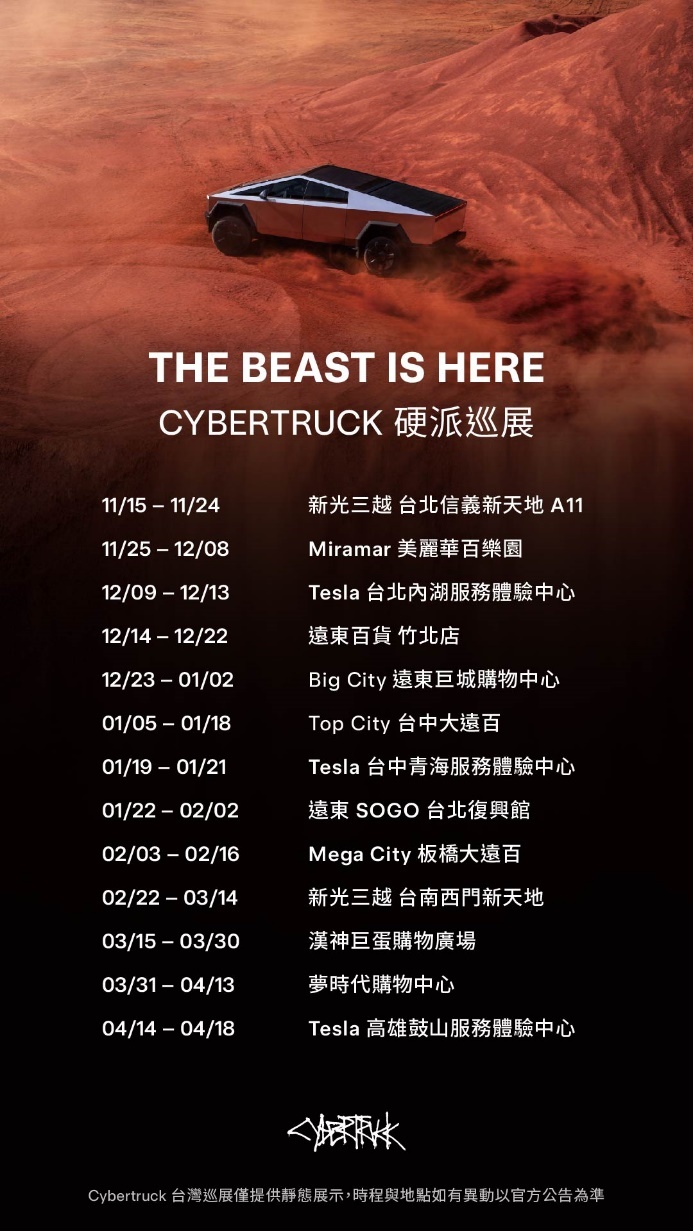 Cybertruck 硬派巡展即日起於新光三越 台北信義新天地 A11 體驗店開展,陸續將前往北中南超過 13 個站點,將使全台消費者與車迷有機會一睹 Cybertruck 獨特魅力,參與 Cybertruck 硬派巡展並完成指定步驟即可兌換限定明信片,每一站點前 50 名參展者更可獲得硬派巡展限定紀念海報。備註:Cybertruck 硬派巡展僅提供車輛靜態展示,目前尚未上市與進行車輛交付,巡展時程與地點如有異動以官方公告為準。